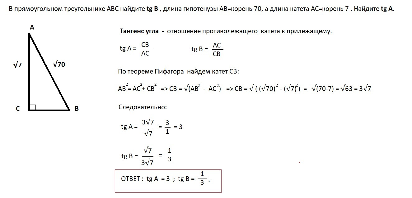 В прямоугольном треугольнике ABC найдите tg B , длина гипотенузы AB=корень 70, а длина катета AC=корень 7 . Найдите tg A