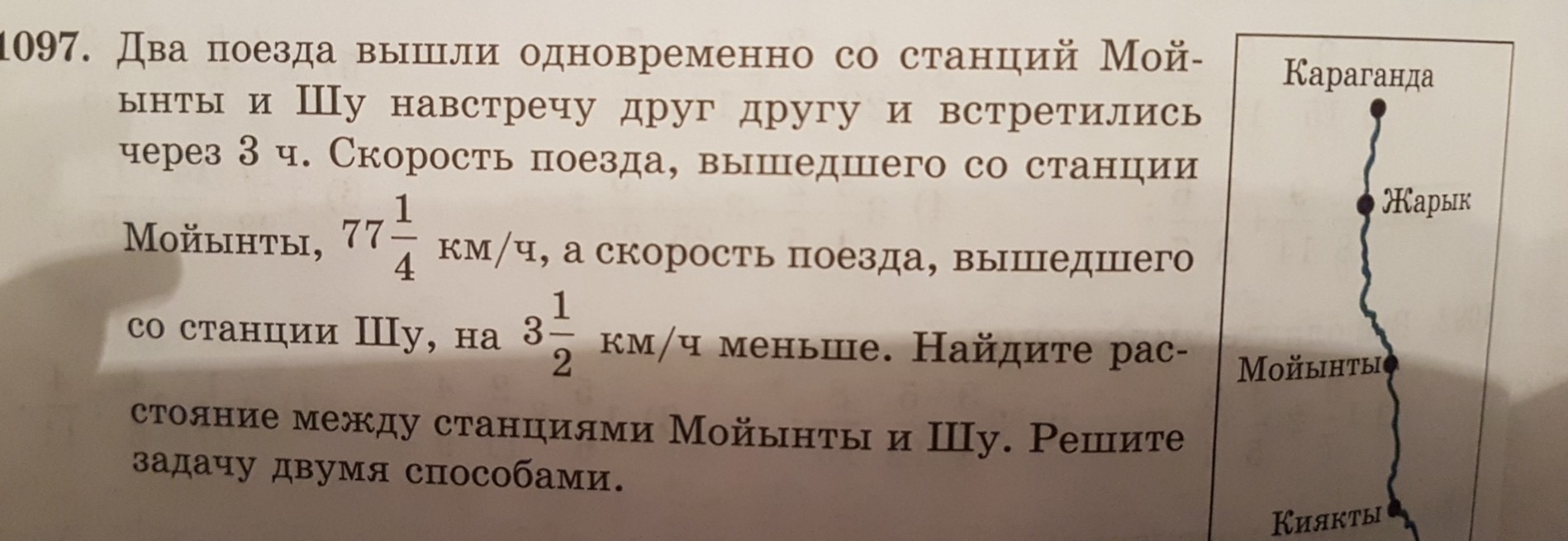 Переведем дроби в неправильные:77 1/4 = 309/43 1/2 = 7/2309/4 -7/2 =295/4 - скорость поезда вышедшего из Шу309/4 + 295/4 = 604/4 = 151 км/ч - скорость приближения поездов151 * 3 = 453 км - расстояние между станциями
