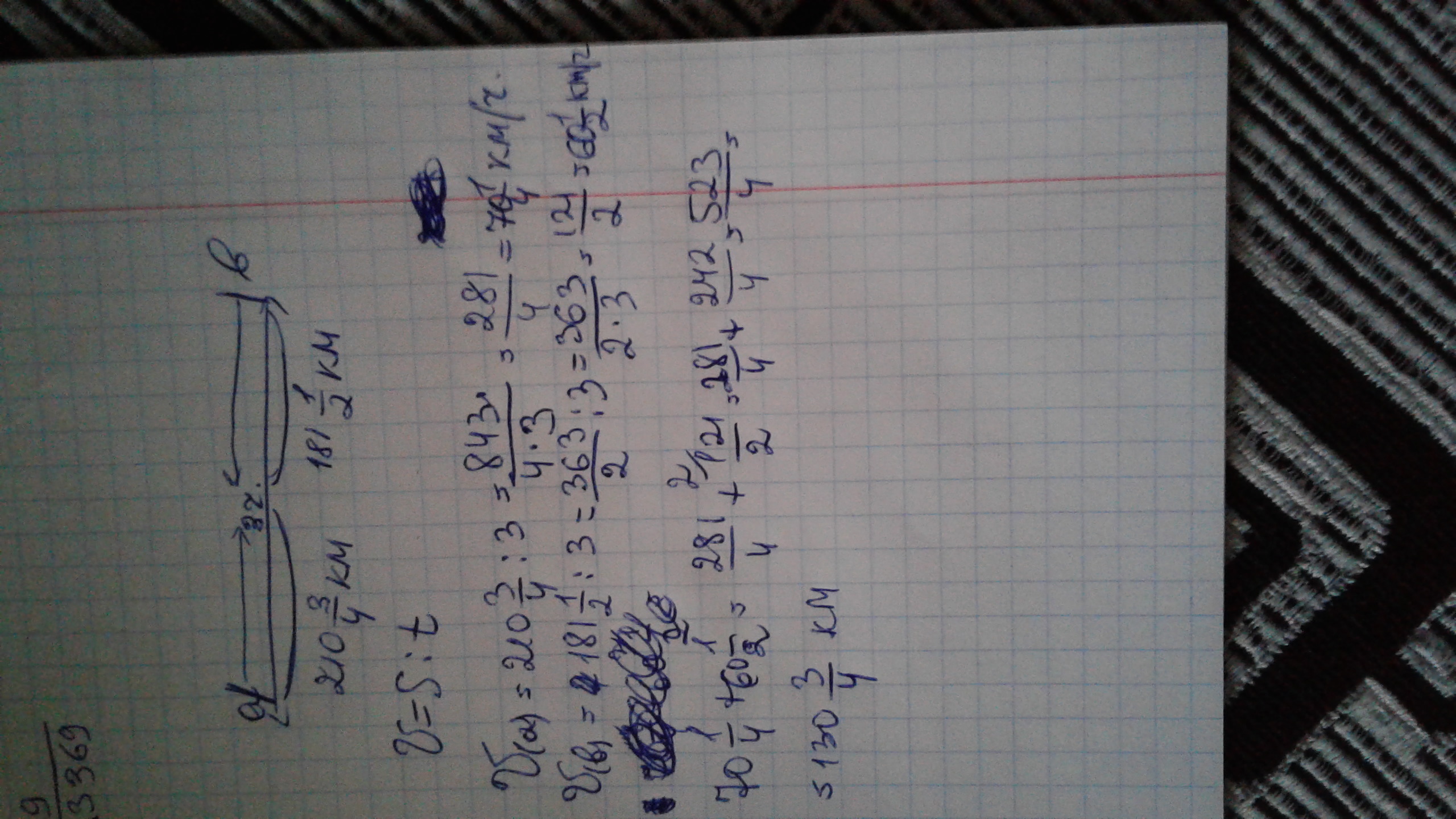 помогите пожалуйста! два поезда вышли одновременно со станций А и В навстречу друг другу и встреьились через 3 часа.До встречи первый поезд прошел 210 3/4 км а второй 181 1/2 км.На сколько километров сблизится поезда за час.