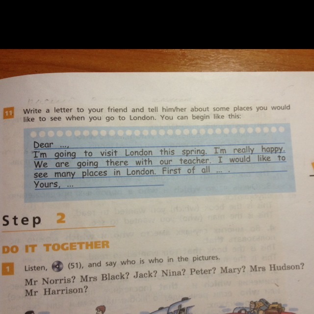 Хорошо. постараюсь. если бы я только достопримечательности Лондона знала. I'd like to see the Big Ben. I know, that it is very big ang there was a clock face(циферблат). Also I want to go for a walk through the narrow streets(узкие улочки) of Lonfon. Yours, (свое имя)