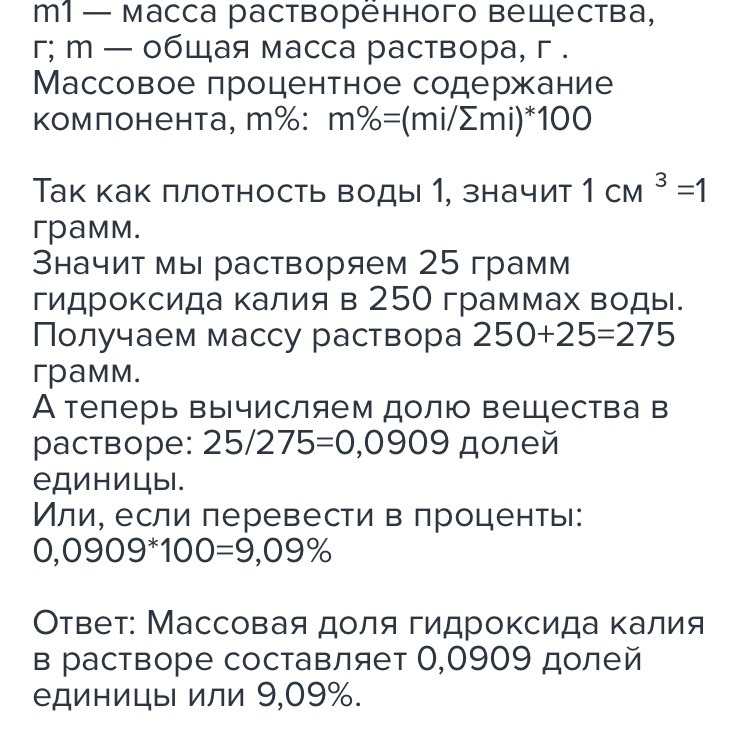 определите массовую долю гидроксида калия в растворе 25 г KOH в 250см3 воды. Желательно оформить как задачу. Пожалуйста!!