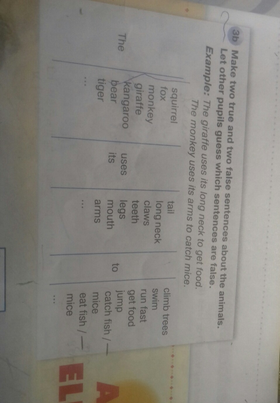 false(неправильные): the bear uses its mouth to jump(медведи используют зубы что бы прыгать.). The squirrel uses its tail to swim ( белки используют свои шеи что бы плавать. )