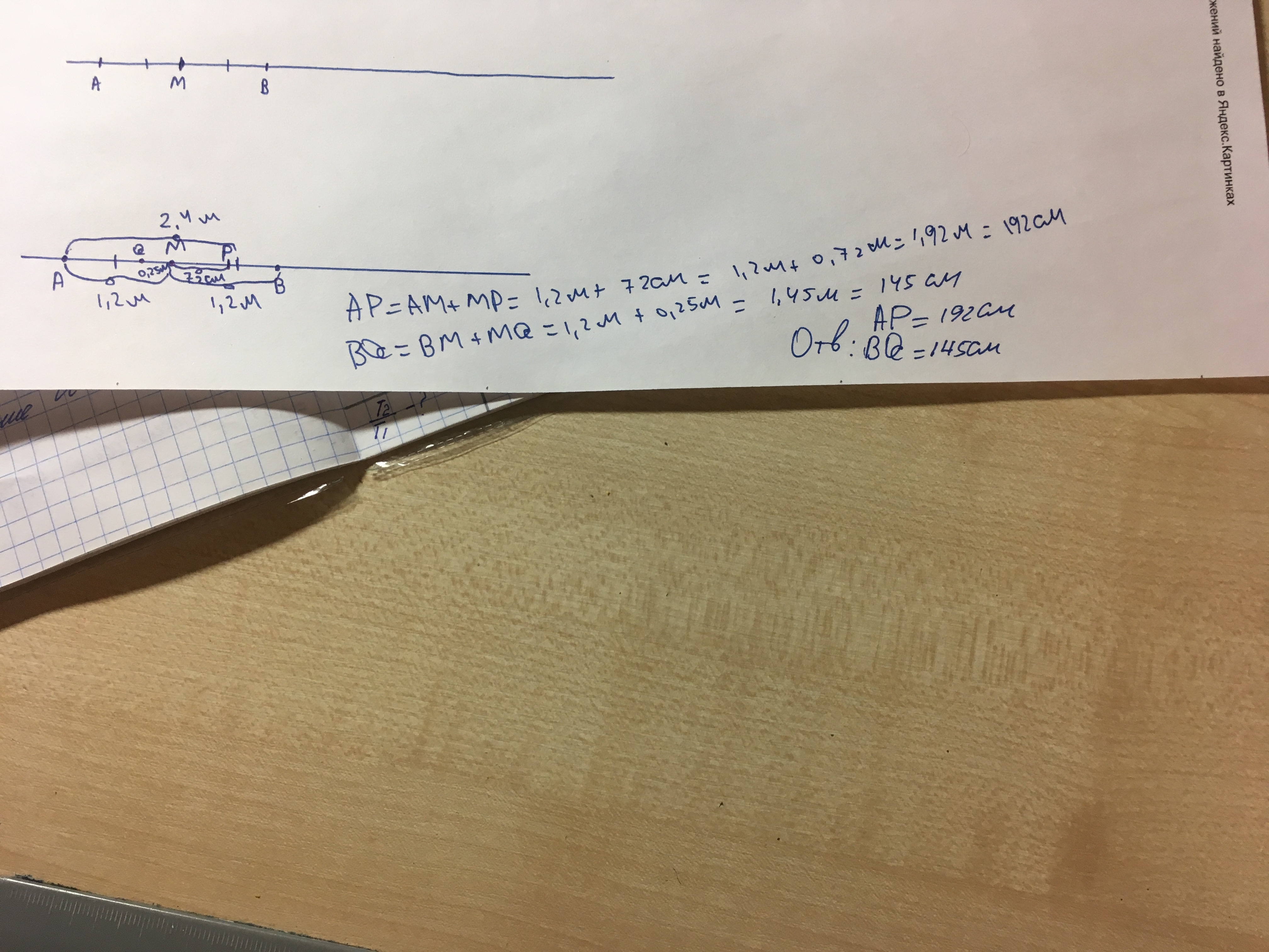 От середины М отрезка АВ,равного 2,4 м отложены на прямой АВ отрезки МР=72см и МQ=0,25м найдтте длины отрезков АР и ВQ в дм,если РQ=97см
