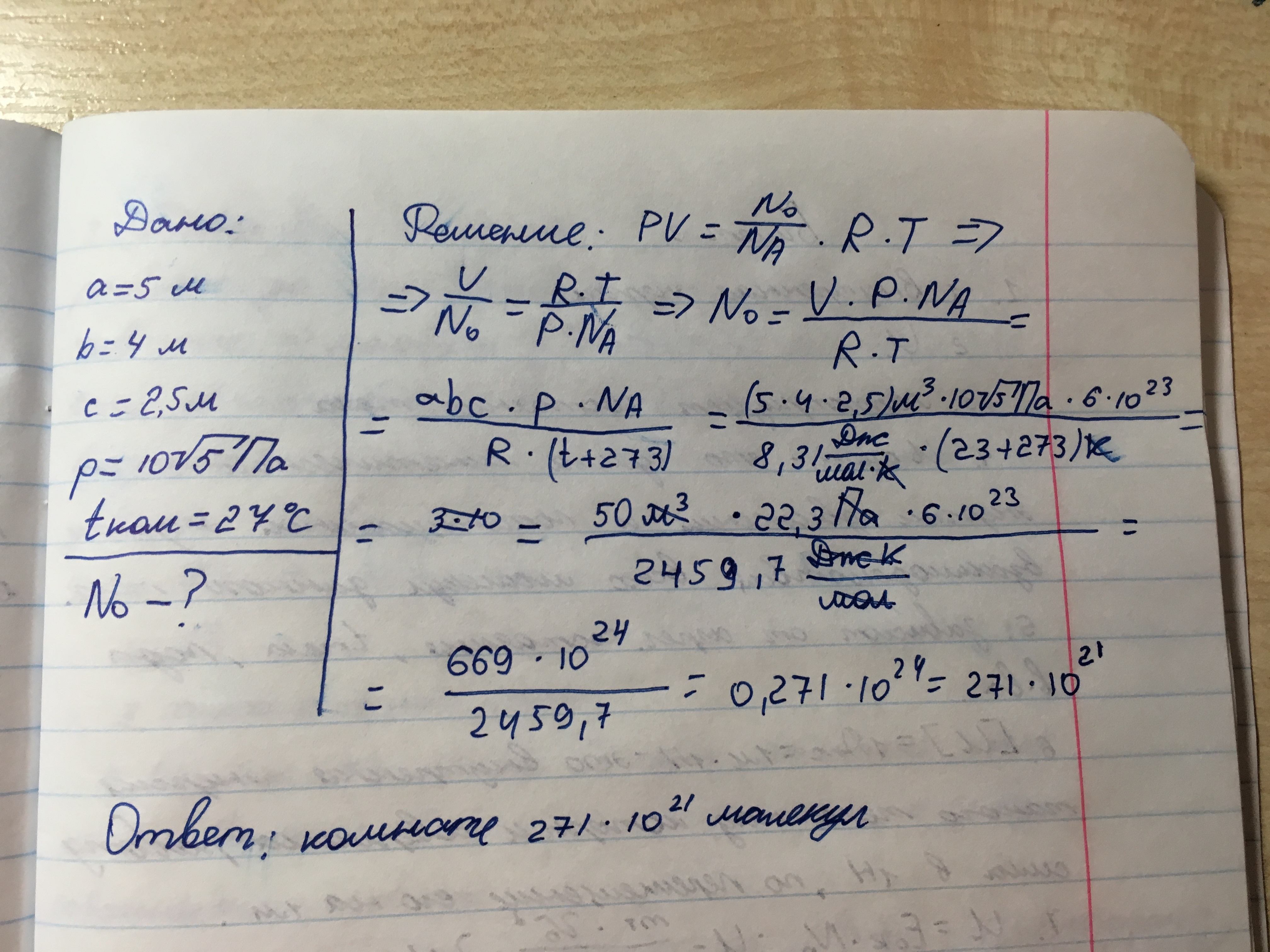Считая воздух идеальным газом определите число молекул воздух в комнате размерами 5х4х2,5 м при давлении 10корень5 Па и температуре 27 С