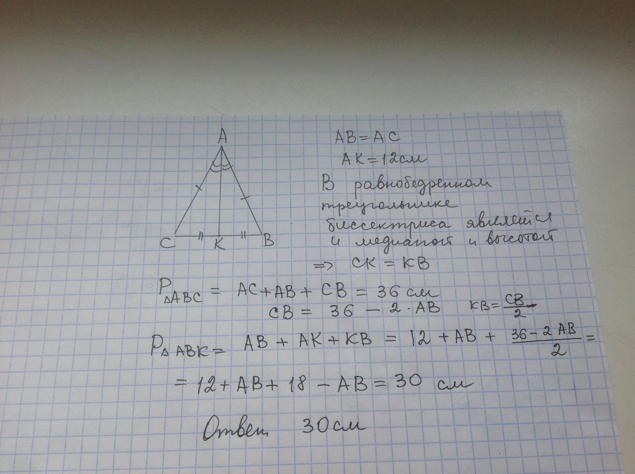 Дан равнобедренный треугольник ABC у которого AB=AC.Его периметр =36 см.Биссектриса AK=12 см.Найдите периметр треугольника ABK.СРОЧНО ПОЖАЛУЙСТА!