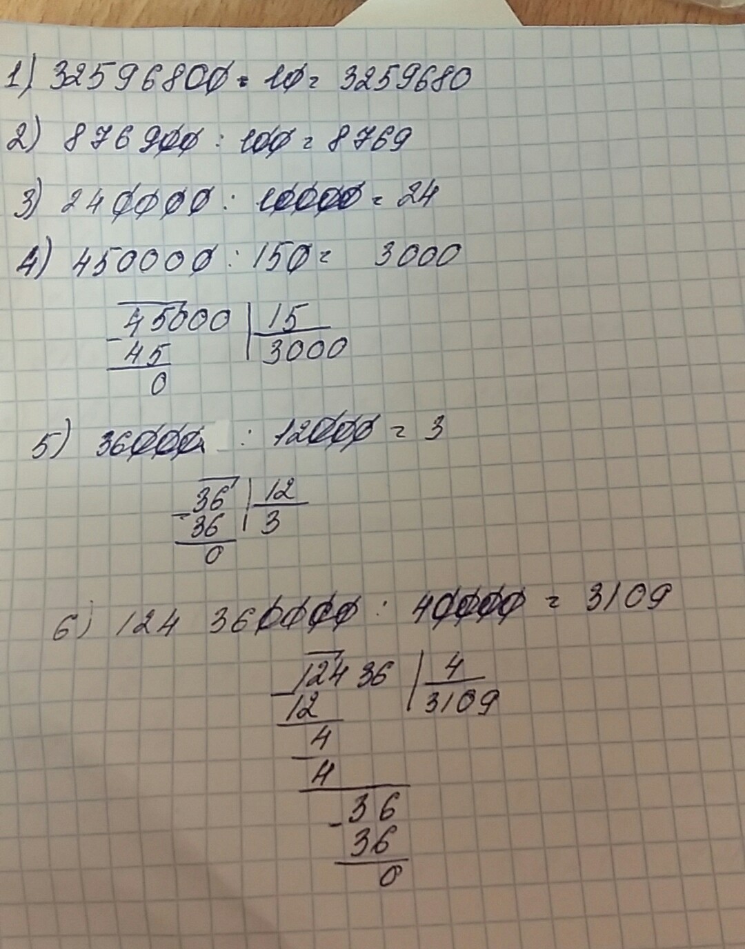 Выполните деление: 1) 32 596 800:10 2) 876 900:100 3) 240 000:10 000 4) 450 000:150 5) 36000:12 000 6) 124 360 000:40 000 (столбиком) пожалуйста.