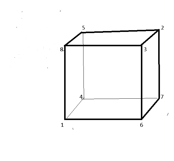 Розставити числа 1, 2, 3, 4, 5, 6, 7, 8. в вершинах куба так щоб суми чисел на кожній грані були рівними