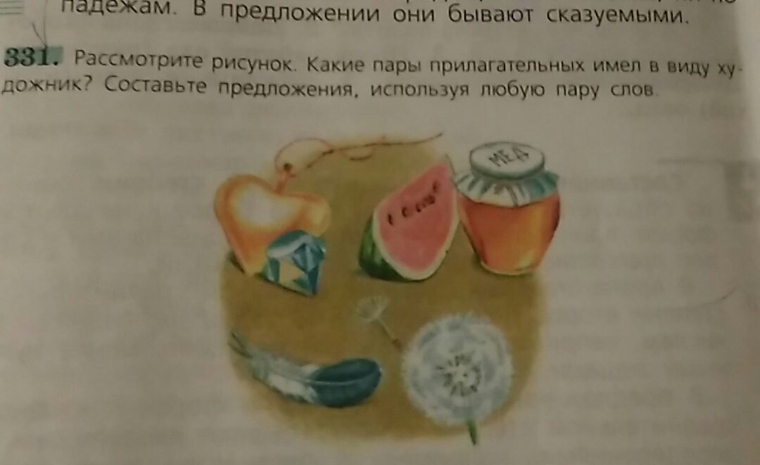 Золотое сердце,красный арбуз,лёгкое пёрышко,пушистый одуванчик,дорогой бриллиант.Преложение:Всё лето мы покупали красные арбузы,они очень вкусные.