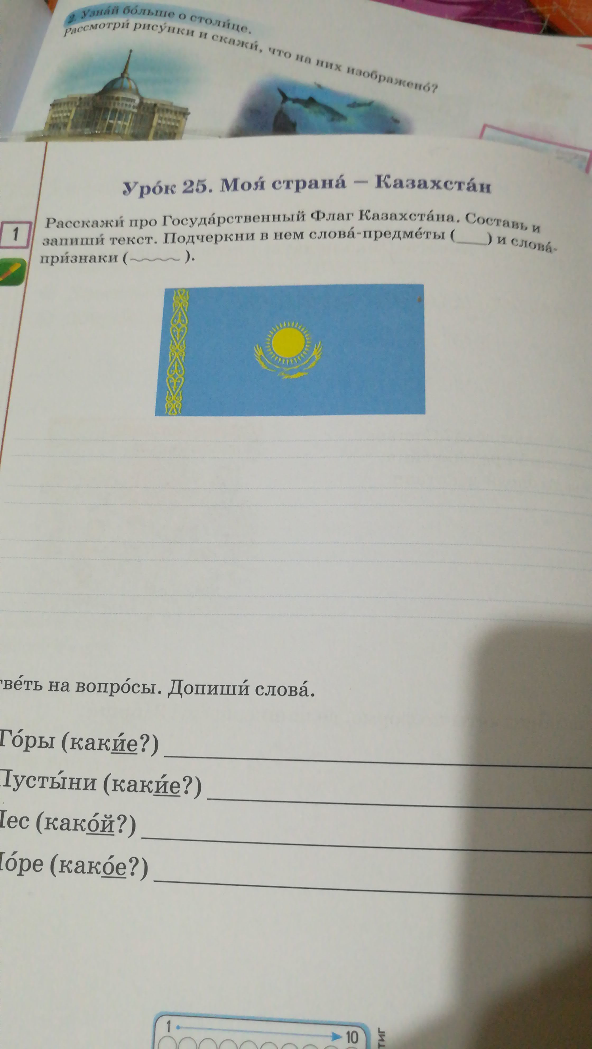 Государственный флаг Республики Казахстан представляет собой прямоугольное полотнище голубого цвета с изображением в его центре солнца с 32 лучами, под которым — парящий беркут. У древка — вертикальная полоса с национальным орнаментом. Изображение солнца с лучами, орла и вертикальной полосы с национальным орнаментом — цвета золота. Соотношение ширины флага к его длине 1:2.