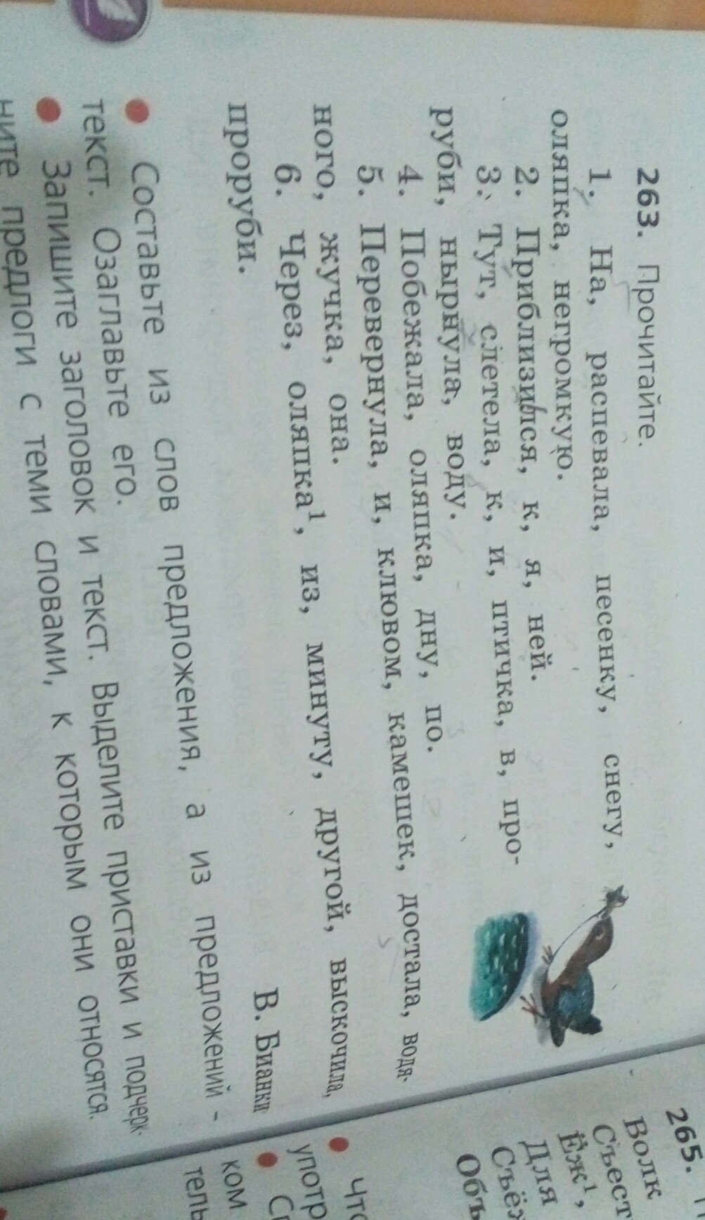 На снегу оляпка распевала не громкую песенку . Я приблизился к ней. Тут птичка слетела к проруби и нырнула в воду. Оляпка побежала по дну. Она