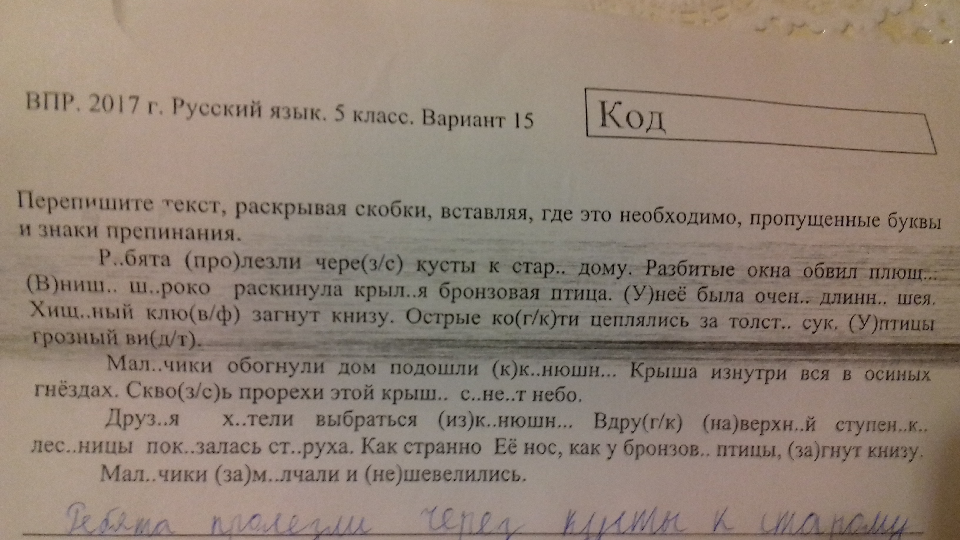 РЕбята пролезли череЗ кусты к старОМУ дому. Разбитые окна обвил плющ. В нишЕ шИроко раскинула крылЬя бронзовая птица. У неё была оченЬ длиннАЯ шея. Хищный клюВ загнут книзу. Острые коГти цеплялись за толстЫЙ сук. У птицы грозный виД.