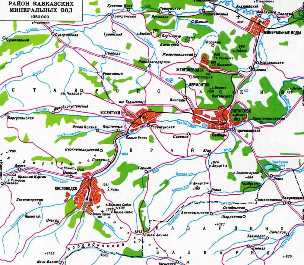 Река Кума, дойдя до Минеральных Вод на юге города, огибает город (сначала течет на восток, затем поворачивает на запад)