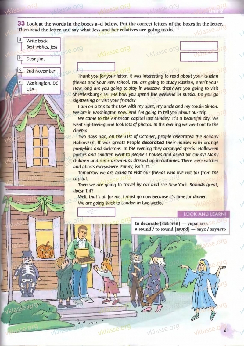 Спасибо за ваше письмо. Интересно было почитать о ваших русскихдрузья и новая школа. Вы собираетесь изучать русский язык, не так ли?Как долго вы собираетесь остаться в Москве, затем? Вы собираетесь посетитьЛиза Санкт-Петербург? Расскажи, как ты проводишь выходные в России. Ты идешь?осмотр достопримечательностей или посещение друзей?Я в поездке в США с тетей, дядей и кузеном Саймоном.Мы сейчас в Вашингтоне. И я расскажу вам о нашей поездкеМы приехали в американскую столицу в прошлое воскресенье. Это прекрасный город. мыпошел достопримечательности и взял много фотографий. Вечером мы пошли вкино.два дня назад, 31 октября, люди праздновали праздникХэллоуин. Это было здорово! Люди украшали свои дома оранжевымитыквы и скелеты. Вечером они устроили специальный Хэллоуин.