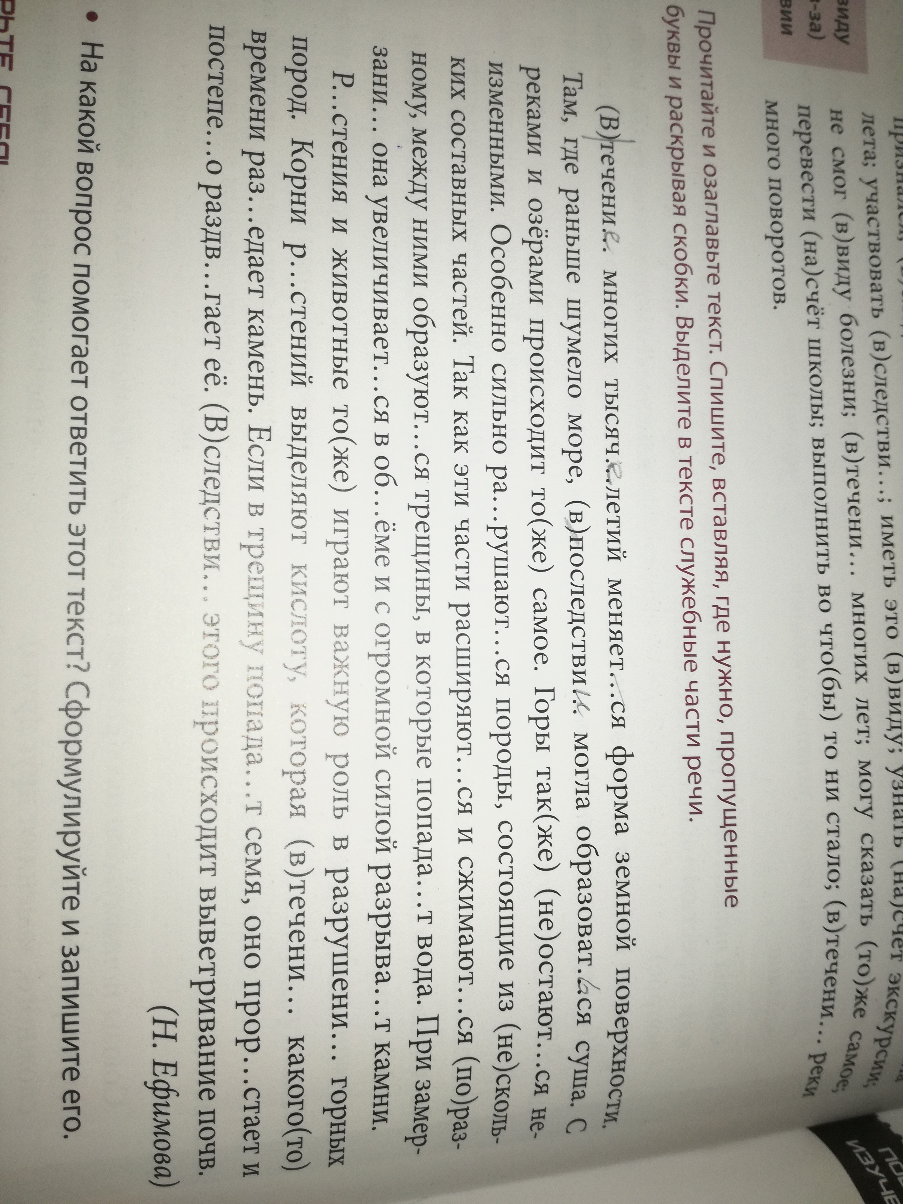 В течение многих тысячелетий меняется форма земной поверхности. Там,где раньше шумело море,в последствии могла образоваться суша.С реками и озёрами происходит тоже самое.Горы также не остаются неизменными.Особенно сильно разрушаются породы,состоящие из нескольких составных частей.Так как эти части расширяются и сжимаются по разному,между ними образуются трещины,в которые попадает вода.При замерзании она увеличивается в объёме и с огромной силой разрывает камни.Растения и животные тоже играют важную роль в разрушении горных пород.Корни растений выделяют кислоту,которая в течение какого то времени разъедает камень.Если в трещину попадает семя,оно прорастает и постепенно раздвигает её.В следствии этого происходит выветривание почв.