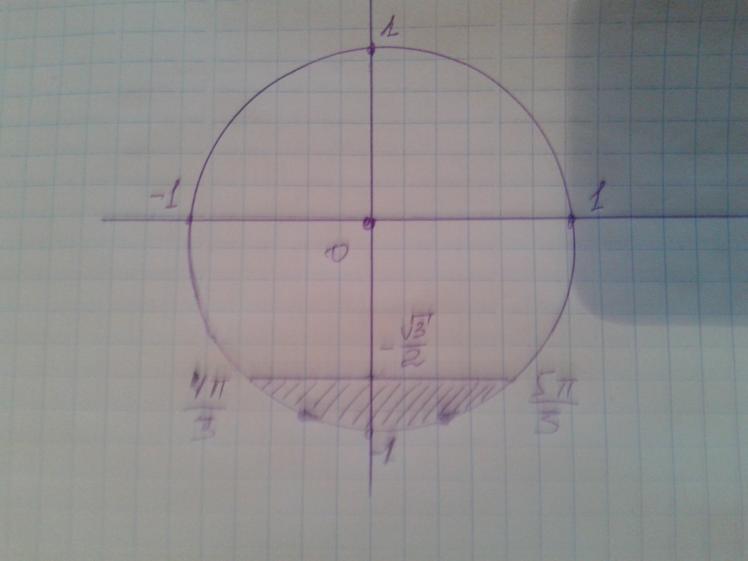 Отмечаем на оси синусов -√3/2 и через эту точку проводим горизонтальную линию. Отмечаем штрихом множество точек тригонометрического круга, sin которого будет меньше =√3/2.