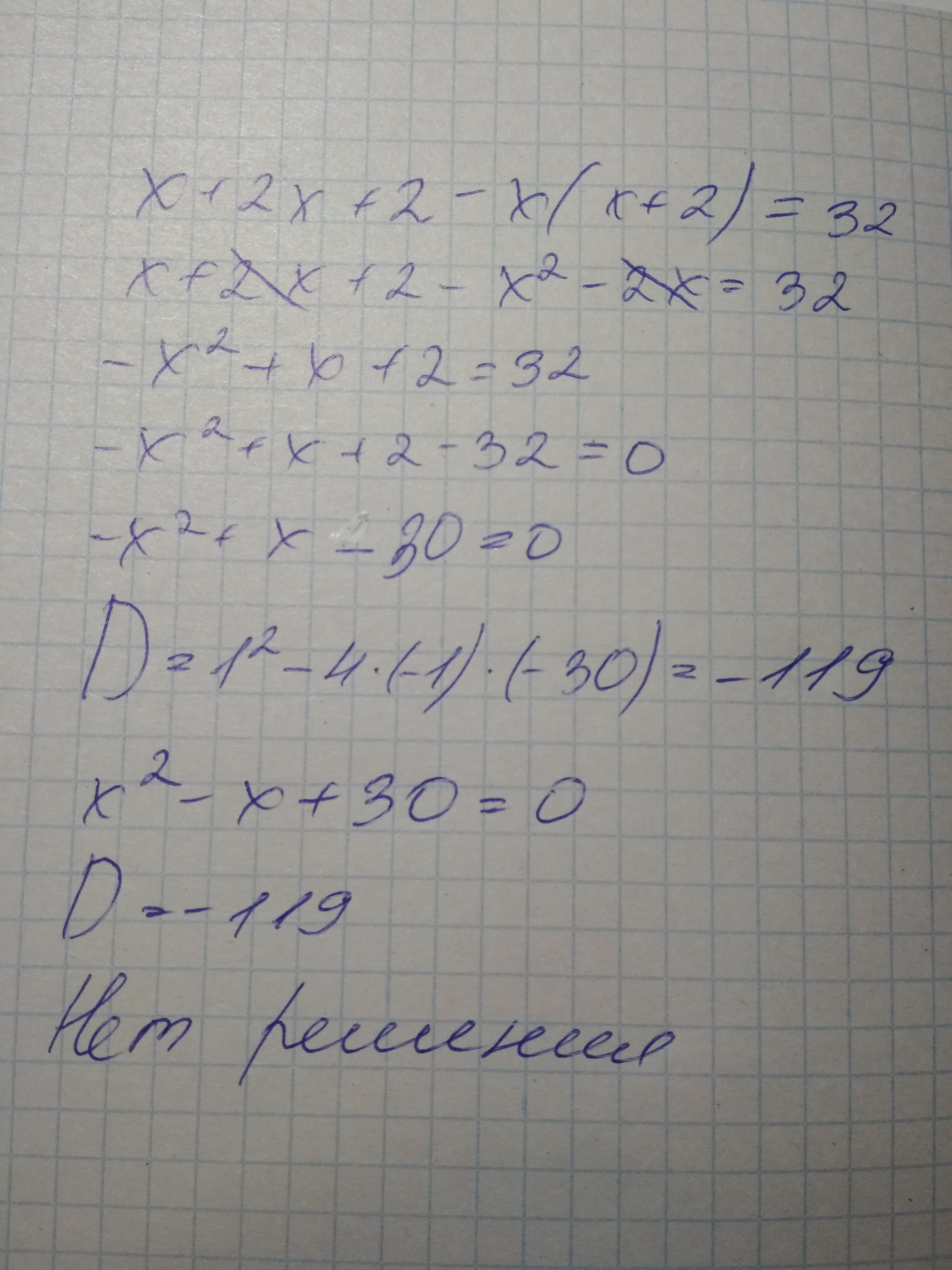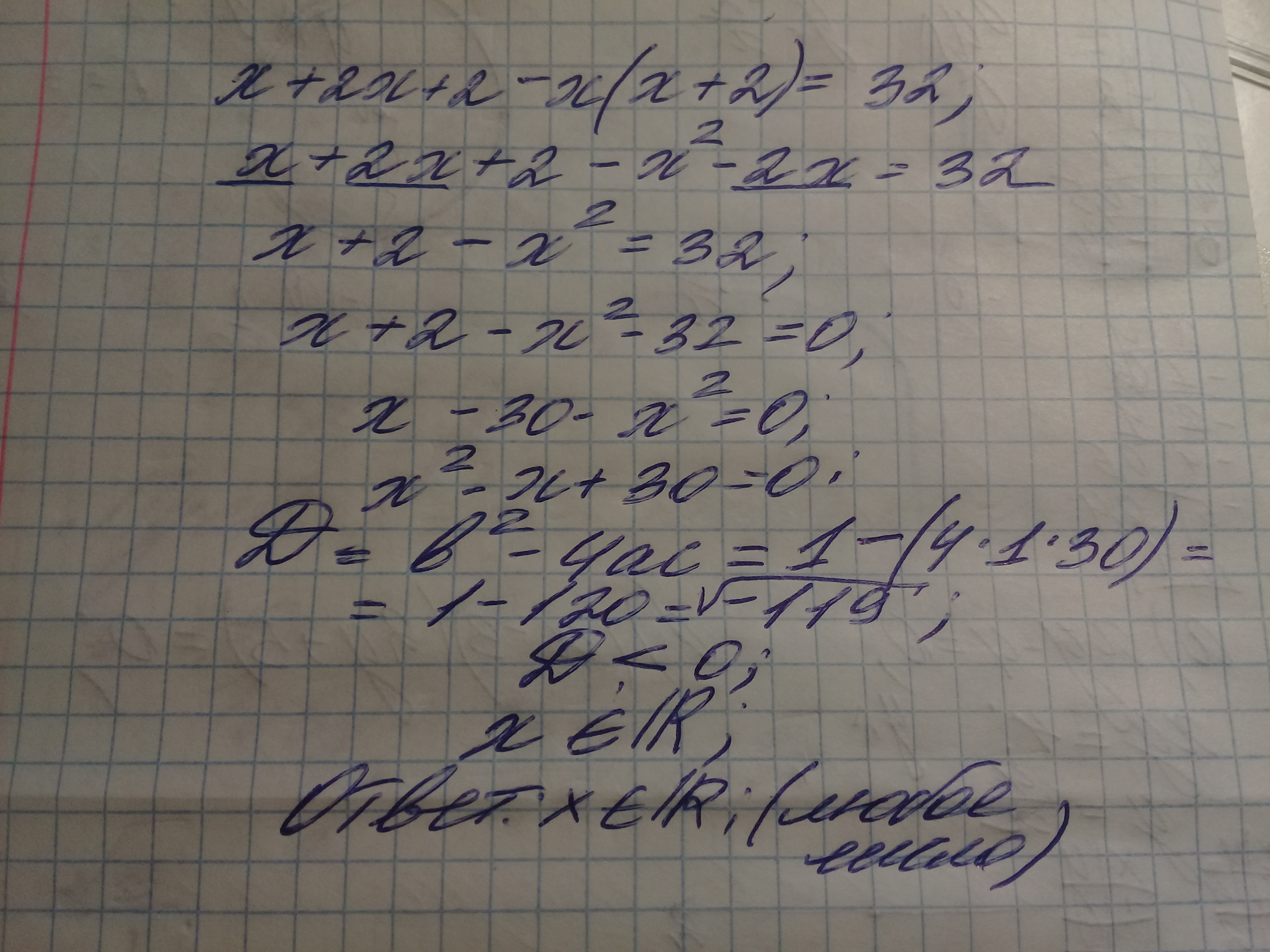Вначале считаешь х (х+2),потом сокращаешь,переносишь все в одну сторону и считаешь дискрим.Он меньше нуля,значит,х-любое число