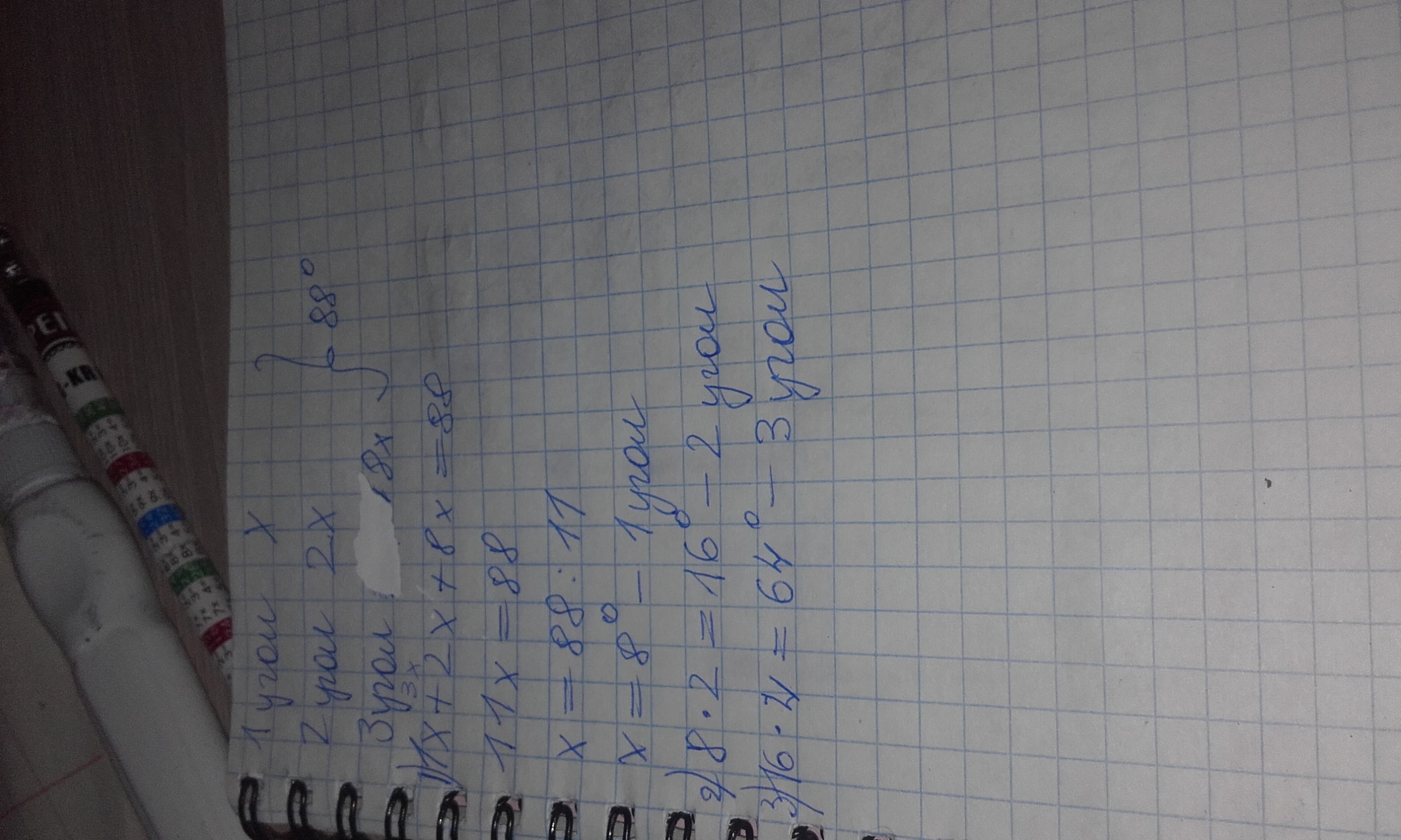 как решать задачу в угле равно 88 градусов проведены 2 луча, которые образуют три угла. Второй угол в 2 раза больше первого и в 4 раза меньше третьего. найдите эти углы.