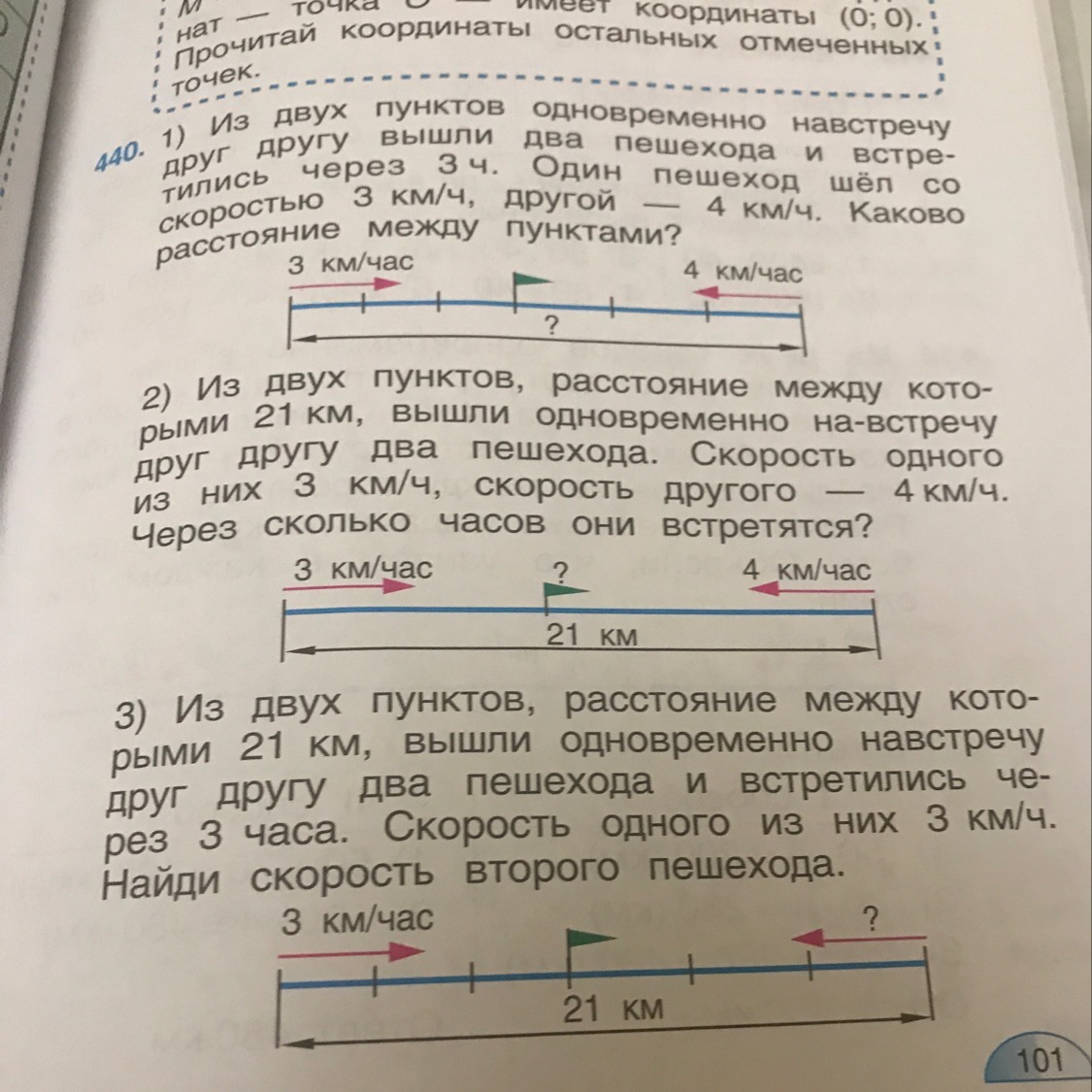 Остальные задачи аналогичны. формула 2ой задачи 3х+4х = 21. х = 3ч, третей задачи 3*3 + 3х=21, х = 4