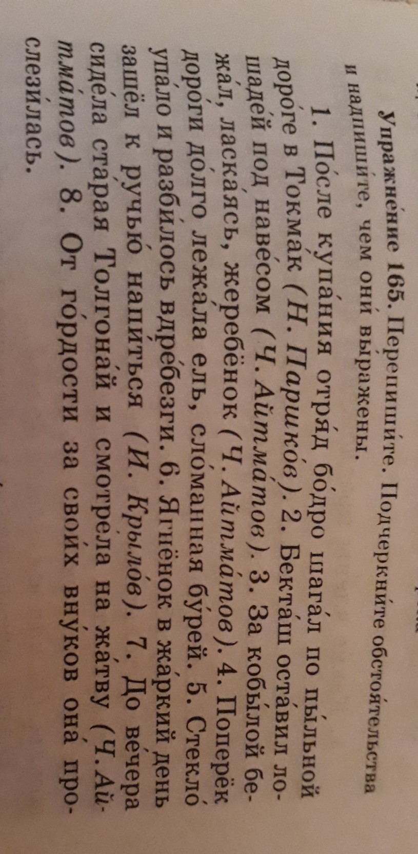 1.После купания(обстоят.,выражено сущ.) отряд бодро(обстоят.,выражено наречием) шагал по пыльной дороге(обстоят.,выражено сущ.) в Токмак(обстоят.,выражено сущ.).2.Бекташ оставил лошадей под навесом(обст.,выражено сущ.).3.За кобылой бежал,ласкаясь(обстоят.,выражено деепричастием),жеребёнок.4.Поперёк дороги(обстоят.,выражено сущ.) долго(обстоят.,выражено наречием) лежала ель,сломанная бурей.5.Стекло упало и разбилось вдребезги(обстоят.,выражено наречием).6.Ягнёнок в жаркий день(обстоят.,выражено сущ.) зашёл к ручью(обстоят.,выражено сущ.) напиться.7.До вечера(обстоят.,выражено сущ.) сидела старая Толгонай и смотрела на жатву.8.От гордости(обстоят.,выражено сущ.) за своих внуков она прослезилась.Обстоятельства подчёркиваются пунктиром с точками.