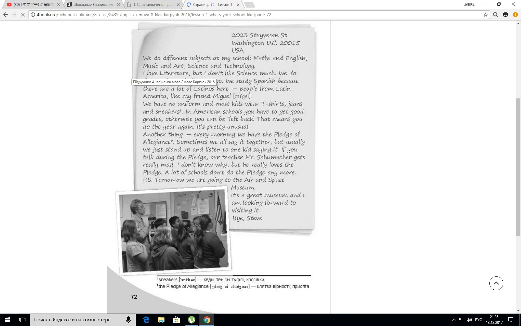 2023 Stugvesan St Washington DC. 20015 США Мы делаем разные sebjects в моей школе: математика и английский, музыка и искусство, наука и фехнология любовь Литература, biut f не нравится Science mach. Мы тоже занимаемся географией и историей. Мы изучаем испанский язык, потому что здесь много латиноамериканцев из Америки Leatin America, мой друг Мигель Имиджелл. У нас нет единой формы, а большинство детей носят футболки, джинсы и халаты. В американских школах вам нужно получить хорошие оценки, иначе вы можете остаться. Это означает, что вы снова делаете год. tt довольно uniesual Еще одна вещь - сегодня утром у нас есть обещание верности. Иногда мы говорим об этом вместе, но обычно мы просто встаем и прислушиваемся к тому, что один ребенок говорит об этом. Гоу во время Залога, наш учитель, г-н Шумахер, злится с ума. Не знаю, почему, он действительно любит Залог. Многие школы больше не делают Залога. PS. Завтра мы отправимся в Air and Space Museim. Это отличный maseum и я с нетерпением жду его посещения. Bye, Steve