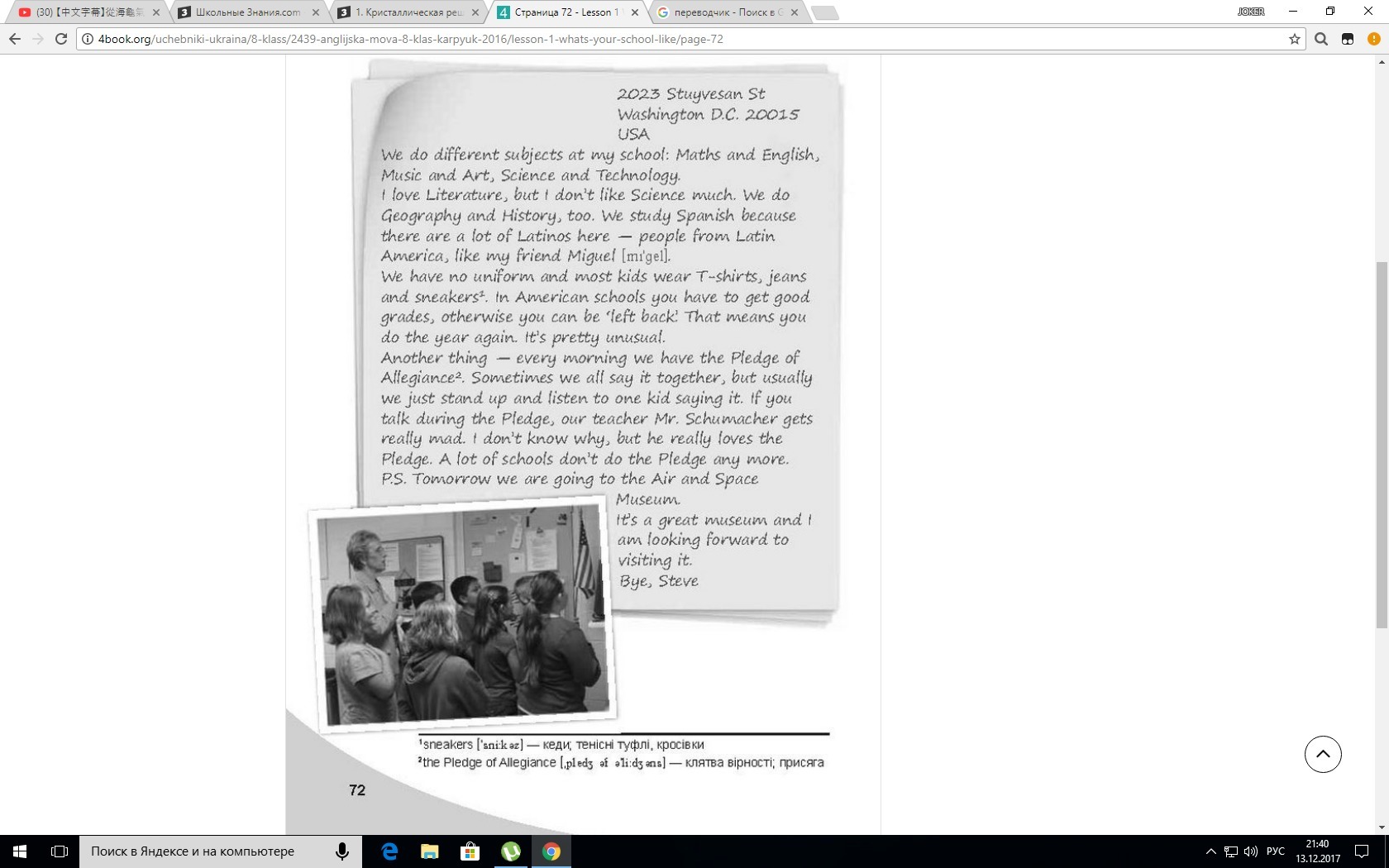 2023 Stugvesan St. Вашингтон, округ Колумбія. 20015 США Ми робимо різні школи в моїй школі: математика та англійська мова, музика та мистецтво, наука і технологія любові, література, біологія, не люблять науки маха. Ми також займаємося географією та історією. Ми вивчаємо іспанську мову, тому що тут багато людей з Латиноамериканського народу з Летін-Америка. Фея мого друга Мігеля Імігельу. У нас немає уніформи, а більшість дітей одягають футболки, джинси та джинси. У американських школах ви повинні отримати хороші оцінки, інакше ви можете залишити назад Це означає, що ти робиш рік ще раз. Це досить однозначне. Інша справа - рано вранці у нас є запорука вірності. Іноді ми говоримо про це разом, але зазвичай ми просто встаємо і слухаємо одного хлопця, який це каже. Гоу розмову під час застави, наш вчитель пан Шумахер знущається з розуму. Ти не знаєш, чому, адже він справді любить Заставу. Багато шкіл більше не роблять Заставу. PS Завтра ми йдемо до Музею повітря та космосу Це чудовий масаум, і ми з нетерпінням чекаємо його відвідування Бай, Стів