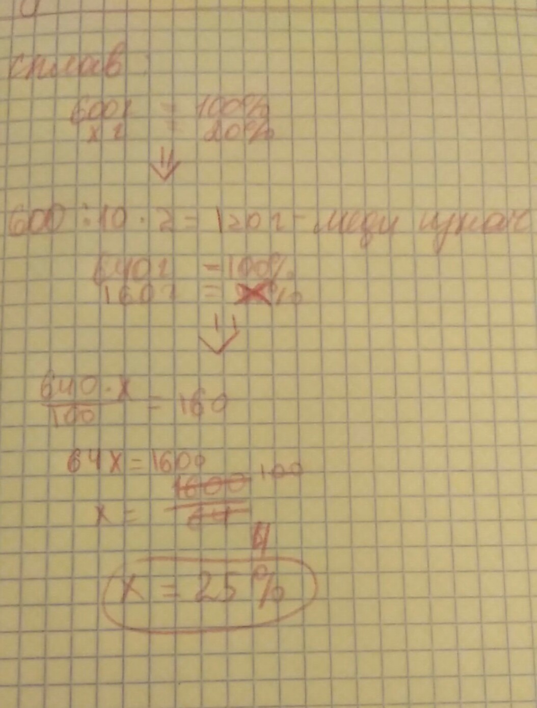 К сплаву массой 600 г., содержавшему 20% меди, добавили 40 г. меди. Каким стало процентное содержание меди в новом сплаве?