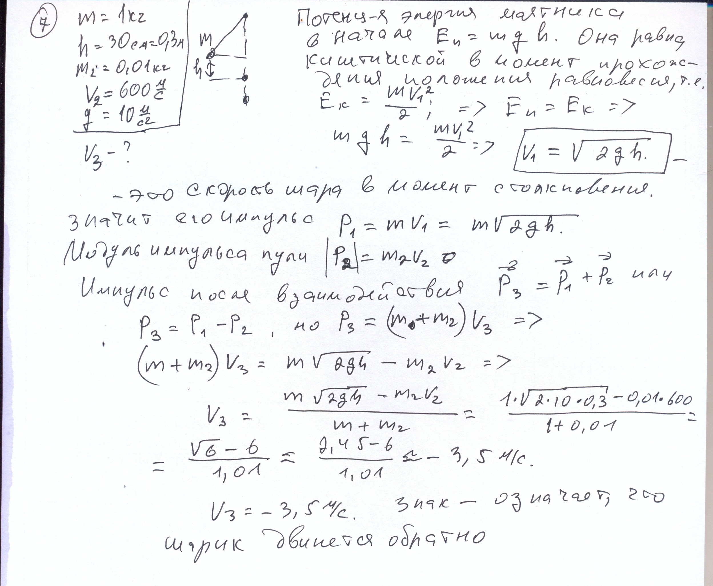 7. Шар массой 1 кг, подвешенный на невесомой и нерастяжимой нити, отклонили от положения равновесия, подняв на высоту 30 см, и отпустили без начальной скорости. В момент прохождения шаром положения равновесия в него попадает пуля массой 10 г, летящая горизонтально навстречу шару со скоростью 600 м/с, и застревает в нем. Найти скорость шара после попадания в него пули. g = 10 м/с2.