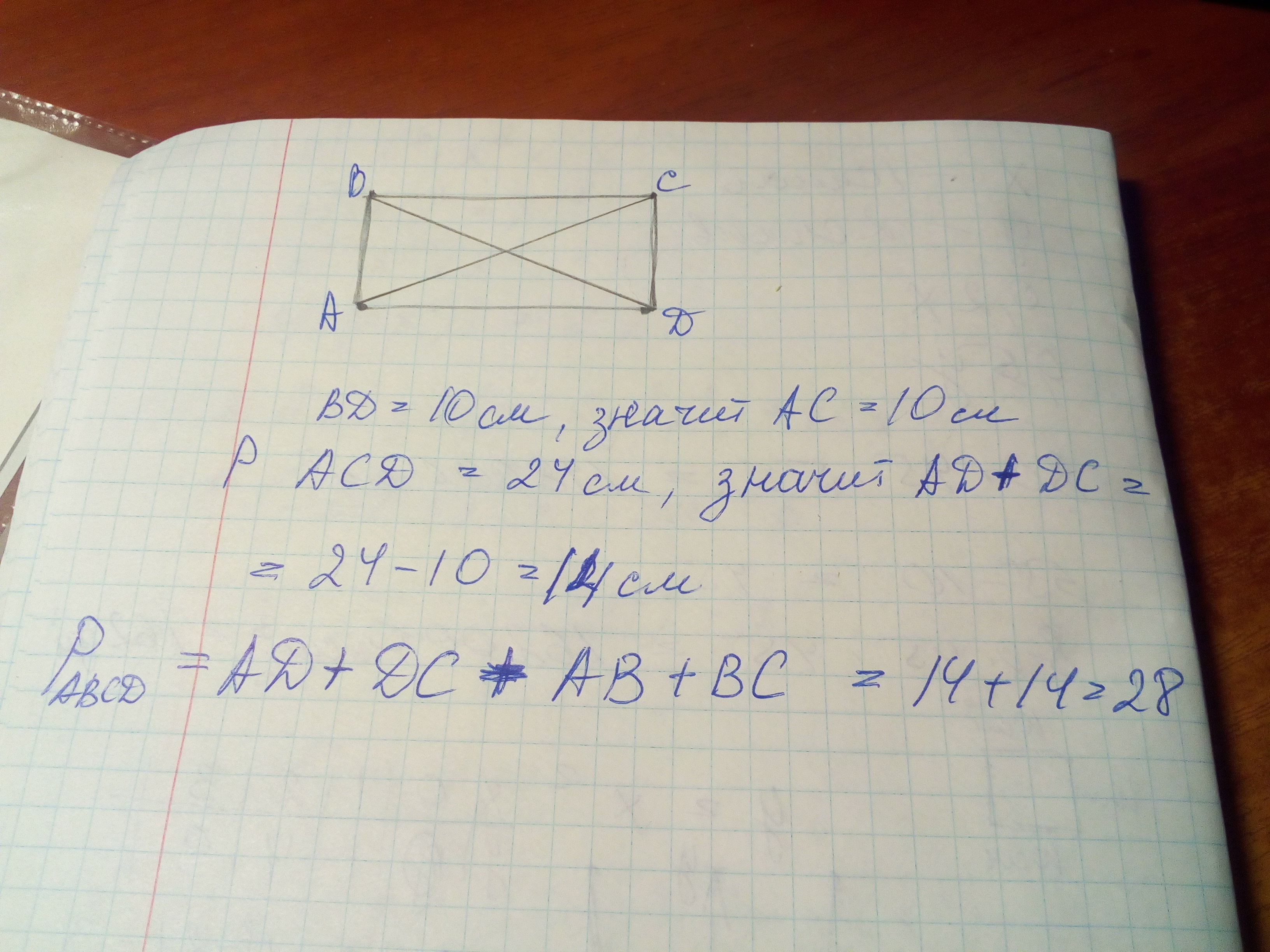 ABCD-прямоугольник, BD=10см.периметр трохугольника ACD равен 24см.Найдите периметр прямоугольника