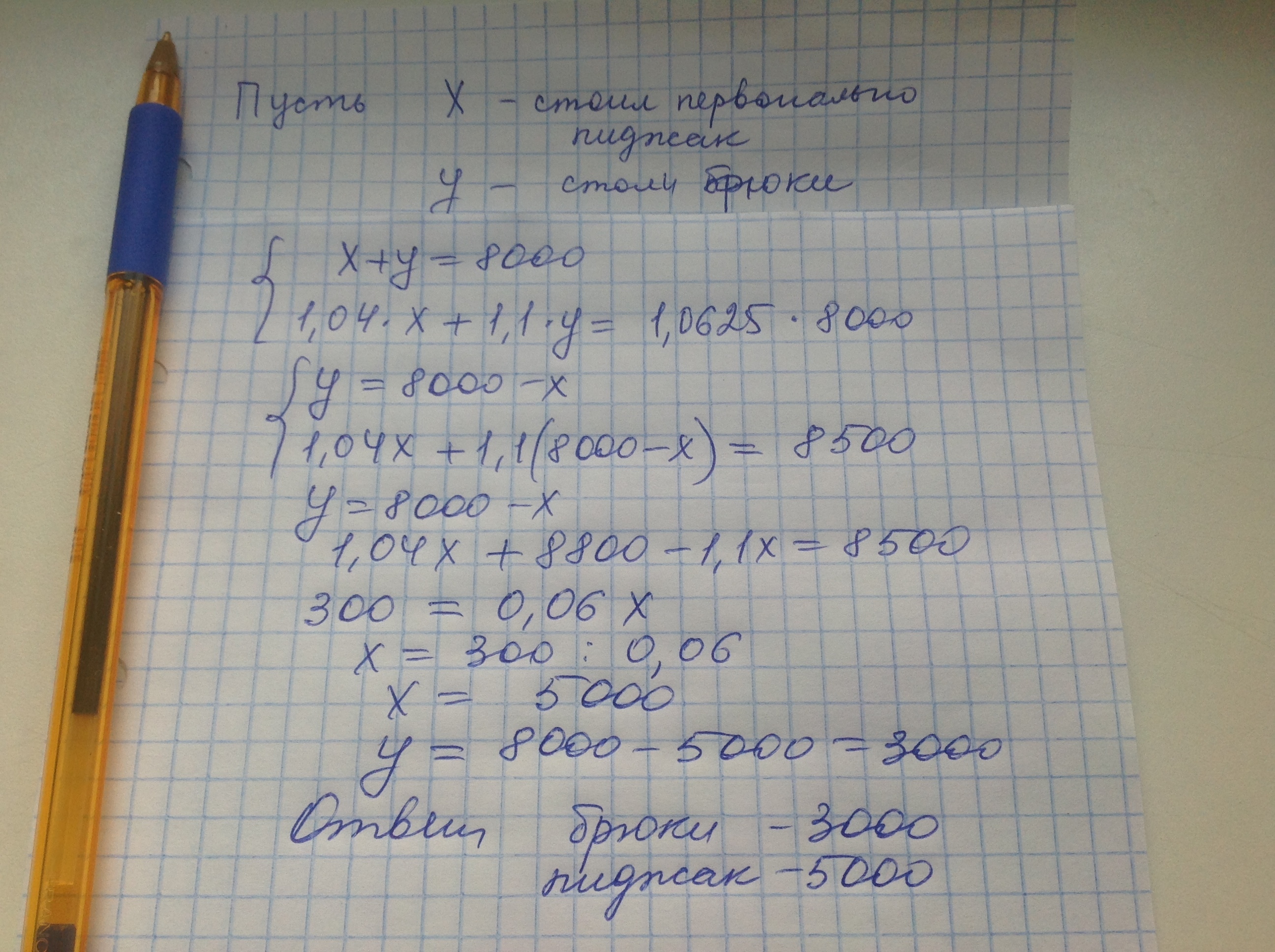 Летом шерстян костюм стоил 8000 цена на пидж увелич 4%на брюки на 10% общая сложн 6.25% Сколько стоили брюки и пиджак отдельно первоначально