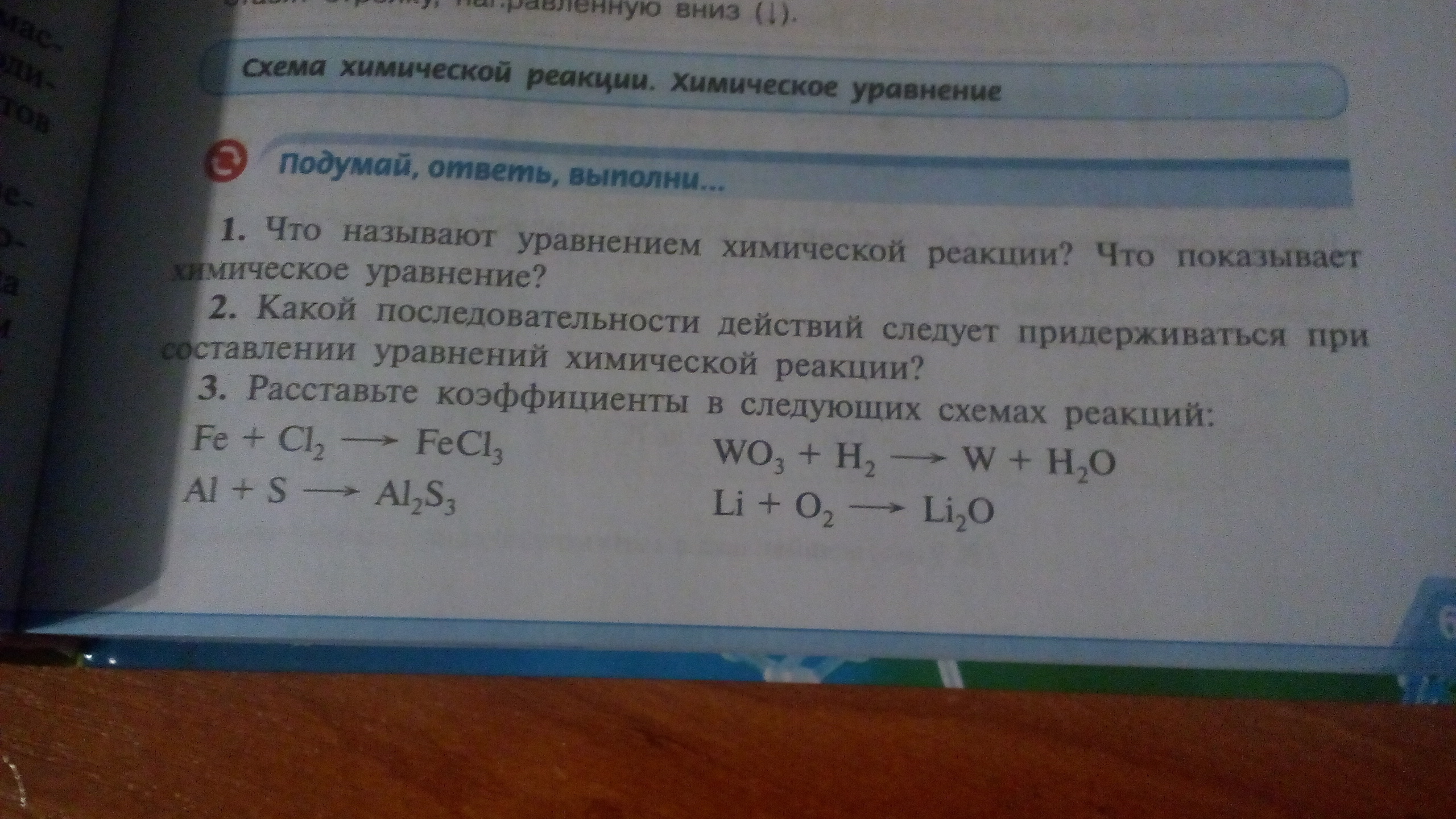 2) (Без понятия что вам говорится в учебнике. Просто перечислю, что делаю я) Написать уравнение реакции, написать, что получается и расставить коэффициенты таким образом, чтобы количество атомов слева было равно количеству атомов справа. Если в какой-то из сторон нечётное количество какого-то элемента, то, скорее всего, эту часть придётся умножить на 2.