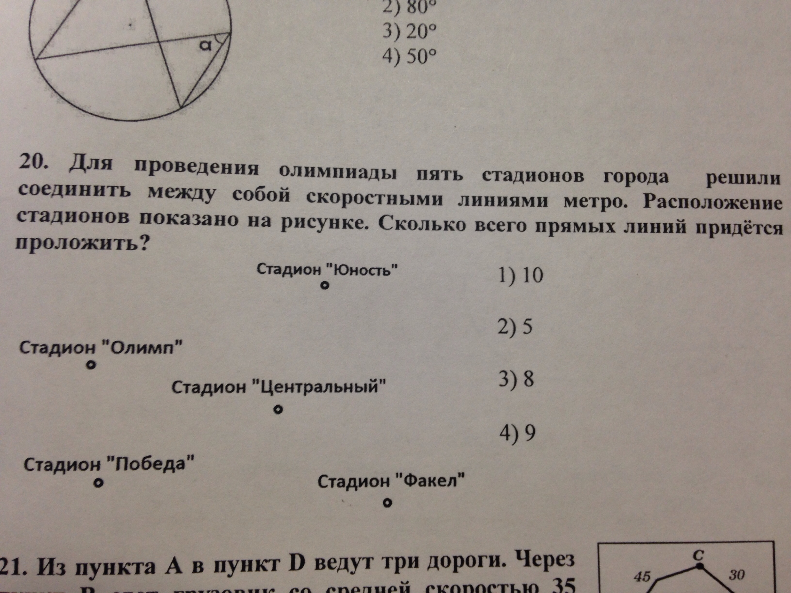 Для проведения олимпиады пять стадионов города решили соединить между собой скоростными линиями метро. Сколько всего прямых линий придётся проложить?
