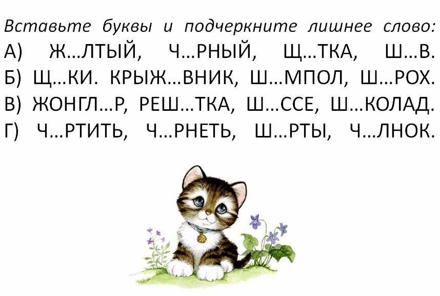 а) Жёлтый, Чёрный, Щётка, Шов-лишнее. б) Щёки-лишнее, Крыжовник, Шомпол, Шорох. в) Жонглёр, Решётка, Шоссе, Шоколад. г) Чертить, Чернеть, Шорты-лишнее, Челнок.