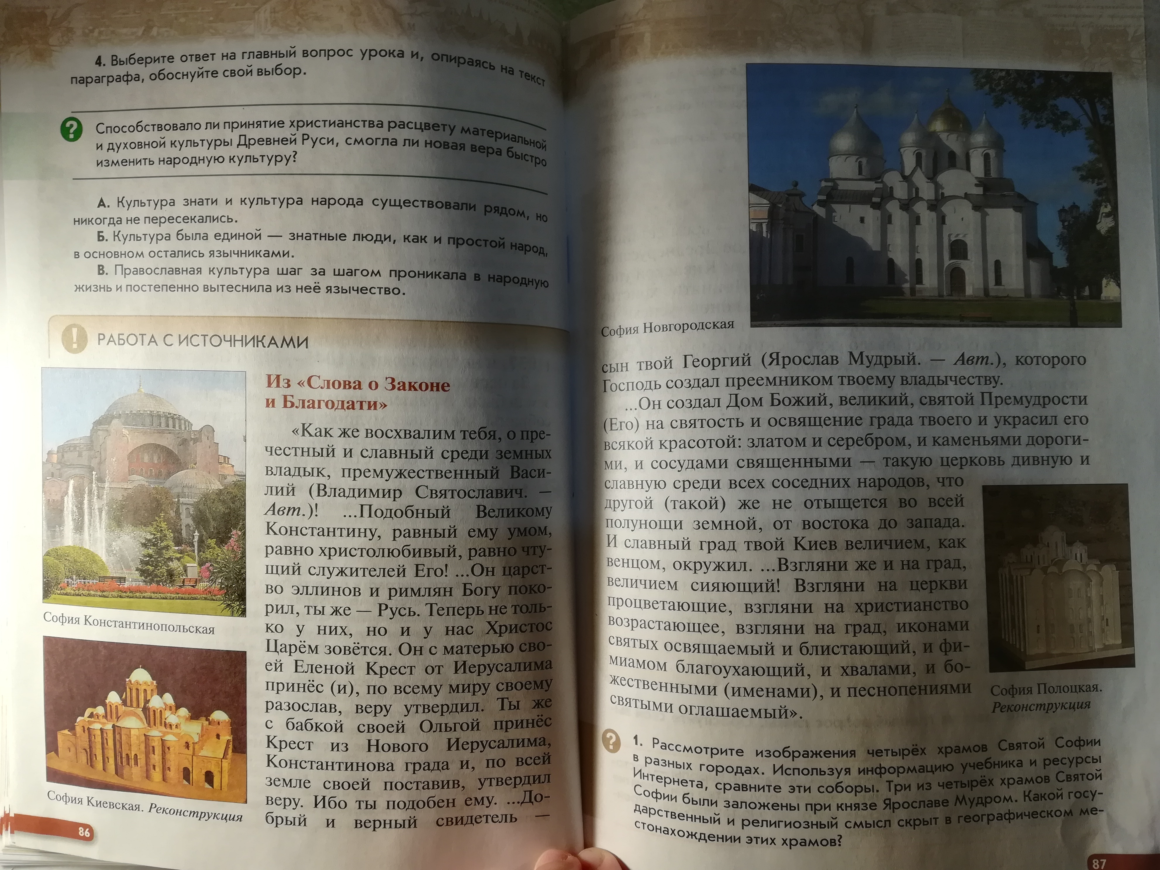 Рассмотрите изображения четырёх храмов Святой Софии в разных городах. Используя информацию учебника и ресурсы Интернета, сравните эти сборы. Три из четырёх храмов Святой Софии были заложены при князе Ярослава Муром. Какой государственный и религиозный смысл скрыт в географическое местонахождении этих храмов?