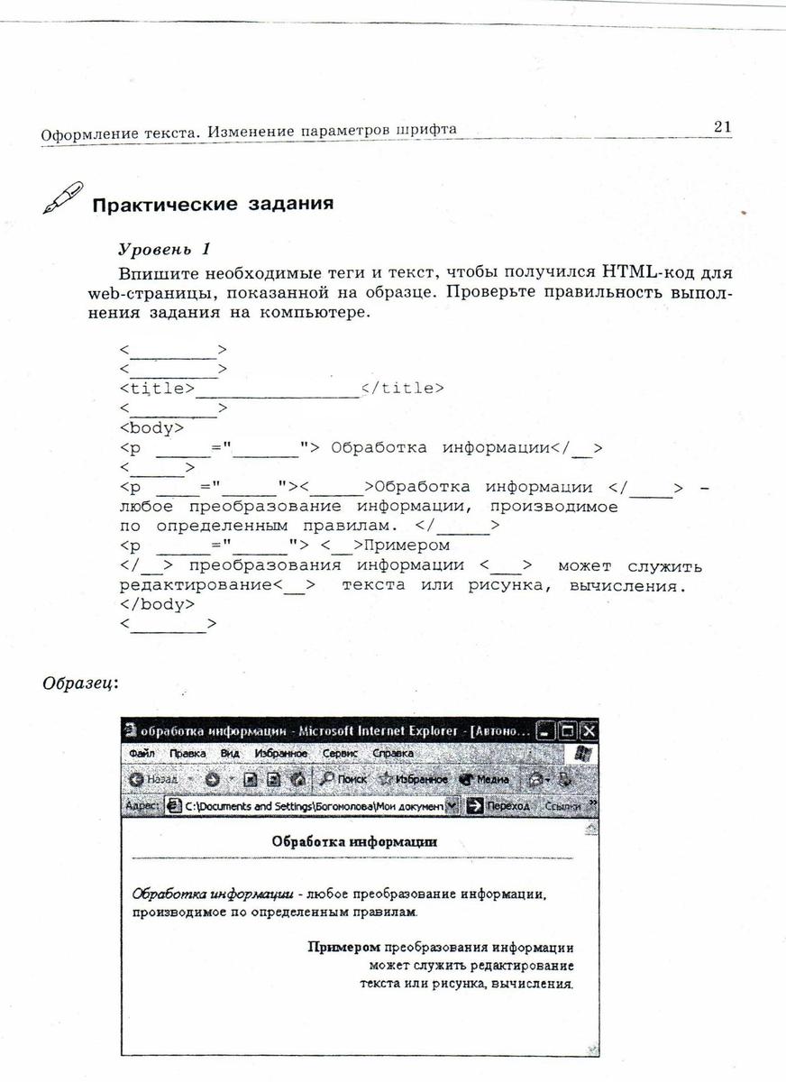 Впишите необходимые теги и текст, чтобы получился HTML-код для web-страницы, показанной на образце.