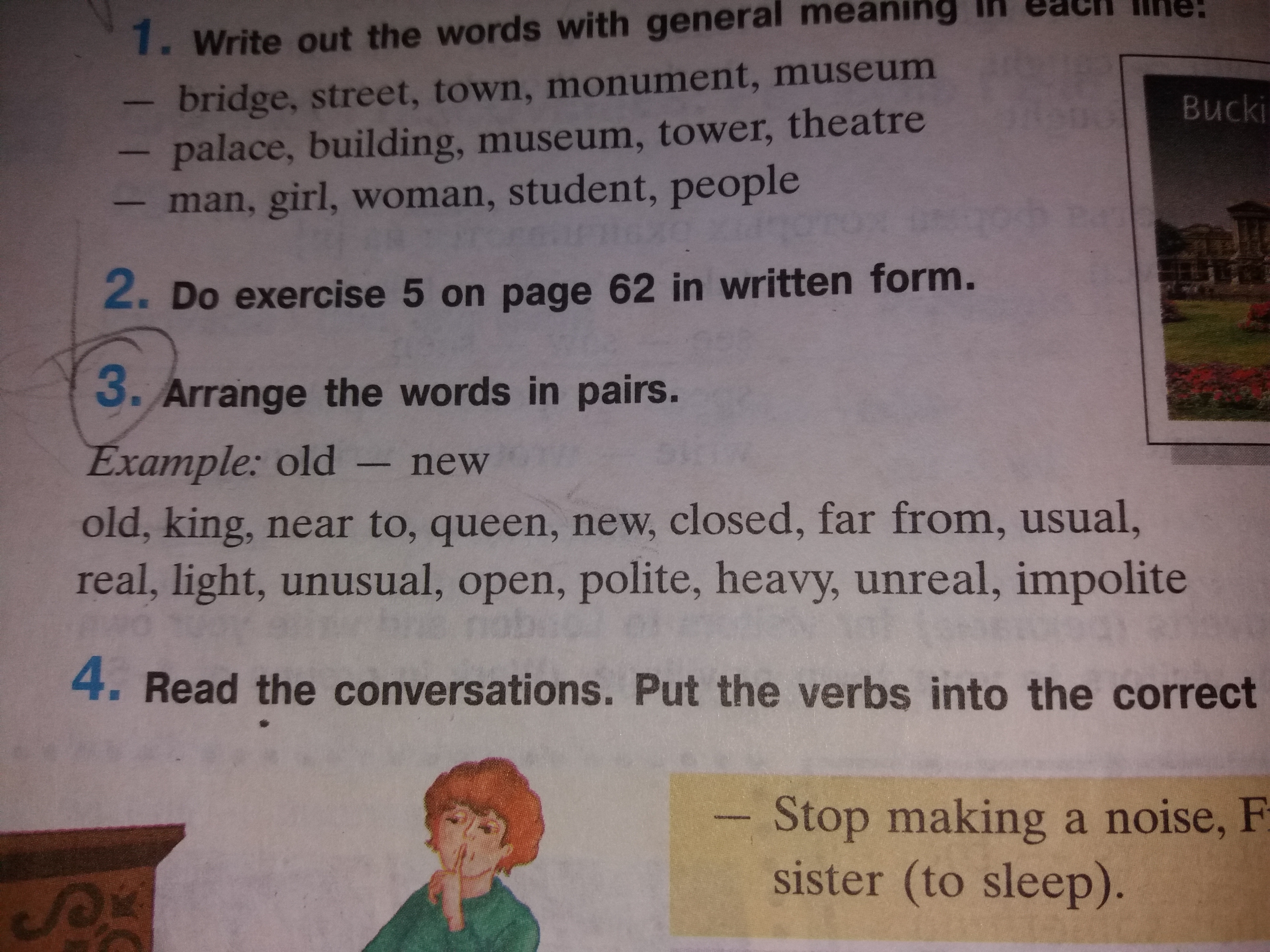 king-queen closed-open far from-near to usual-unusial real-unreal polite-impolite light-heavy