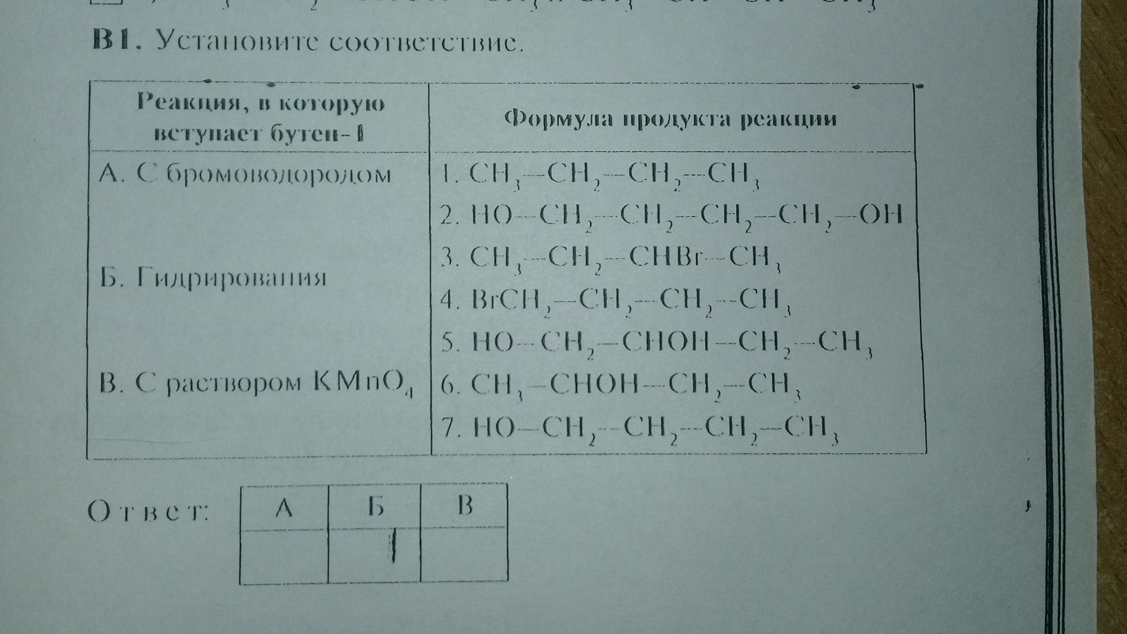 Установите соответствие. Реакция, в которую вступает бутен-1 и формула продукта реакции.