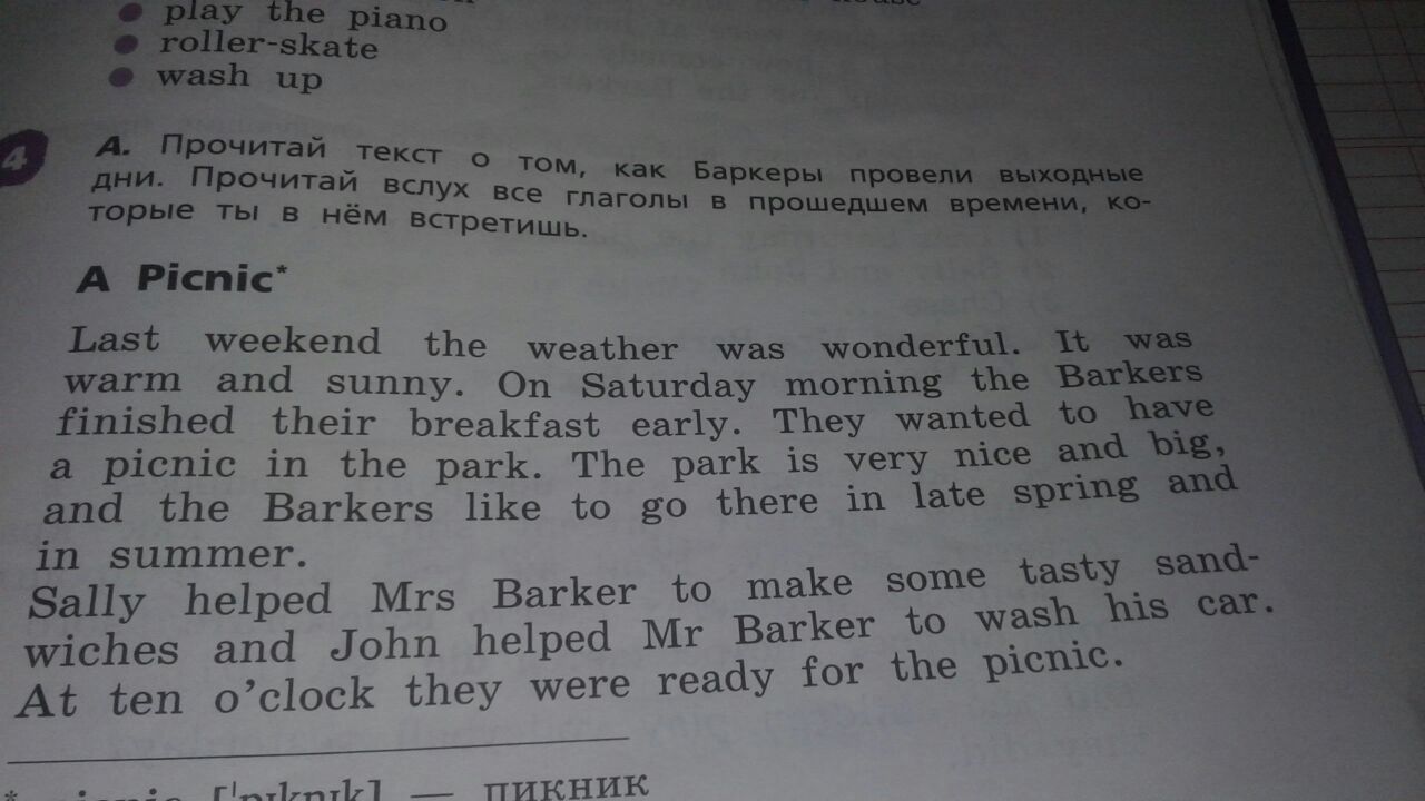 в прошлые в выходные была прекрасная погода. было тепло и солнечно.субботним утром "Баркерс" рано закончил завтракать. он захотел устроить пикник в парке.он был хороший(красивый) и большой, и "Баркерс" нравиться приходить сюда поздней весной и летом.