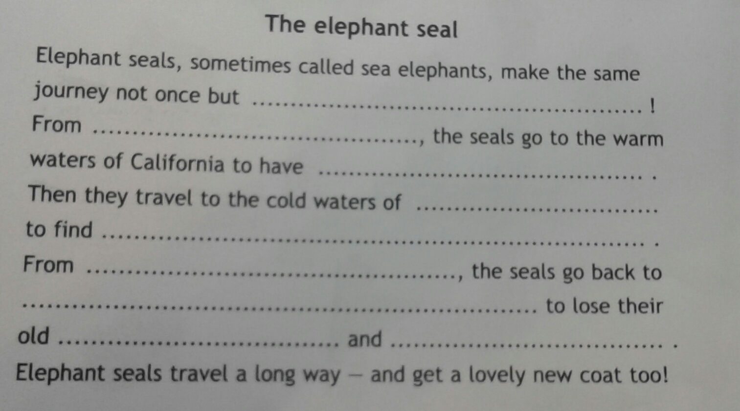Elephant seals, sometimes called sea elephants, make the same journey not once but twice a year. From December to March, the seals go to the warm waters of California to have their babies. Then they travel to the cold waters of Alaska looking for food. From April to August, the seals go back to California to lose their old coat and grow a new one. Elephant seals travel a long way — and get a new coat too!
