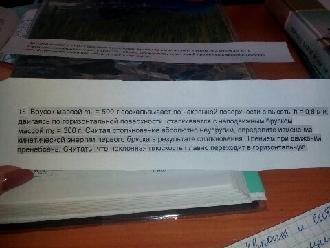 Общая кинетическая энергия обоих брусков (m1+m2)V^2/2=2gh*m1^2/(m1+m2)^2*(m1+m2)/2=gh*m1^2/(m1+m2)