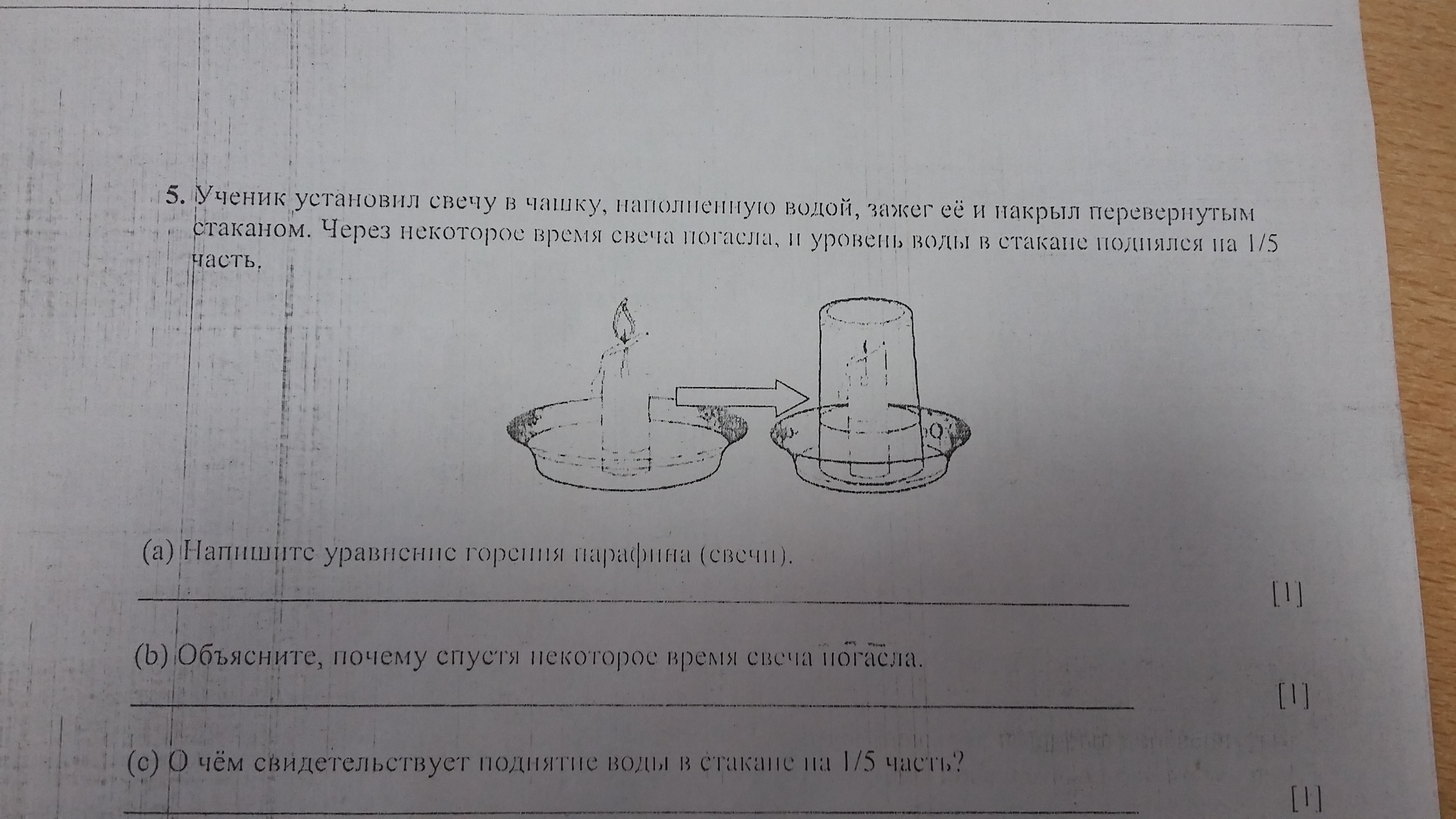 Ученик установил свечу и чашку наполненую водой зажег ее и накрыл перевернутым стаканом. Через некоторое время свеча погасла и уровень воды в стакане на 1/5 часть