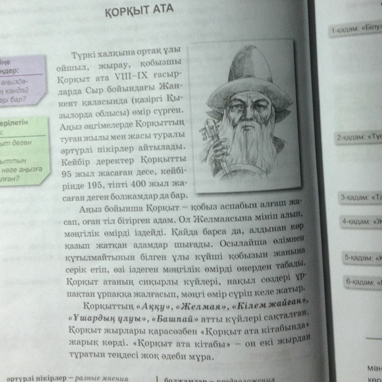 тюркские народы разделяют большой мыслитель, сказочник , кобыз . Коркыт-Ата известен как след в жизни, литературно-музыкальное наследие, оставленное позади. Существуют разные предположения о науке о жизни Корка. Однако большая часть исследований показывает, что Коркыт Ата родился в 10 веке в племени огузов - кипчак , который жил в Сырдарье . Рашид ад-Дин « Jamïğ Аль-Tauarich » историческая хроника Корк стала благотворительность происходит от племени, в то время как Äbilğazınıñ турецкой хроника "« Говорят, что его потомки все еще живы и что огузцы 95 лет и умерли. Это было недалеко от Сырдарьи, где были похоронены А. Диваев и другие. Ученые отмечают в своих работах. Согласно исследованиям А.Кониратбаева, Коркит Ата родился в 11 веке, а в работах А. Маргулана считается, что он жил в VII-VIII веках. Казахская Cork Их укрепили единство страны в истории философии мудрости фигуры, основатель тюркского мировоззрения выдающегося мыслителя , с особым местом в культуре мира психического гуманистического философакак кажется. Из легенд Коркыт-Аты выделяются три типа искусства. Во- первых, это Огуз - Кипчак из престижных владений магии , [[ABYZ (люди) | священник]. Во-вторых , куку - первый актер кобыза . В-третьих, известный поэт , его стихи - литературно-историческое наследие жизни Огуз-Кипчака. Одна из историй о Коркыт-ата в тюркском фольклоре связана с его рождением. Коркыт - великий предок тюркских народов Огуза, великий патриот, шаман, каку, фарфор.