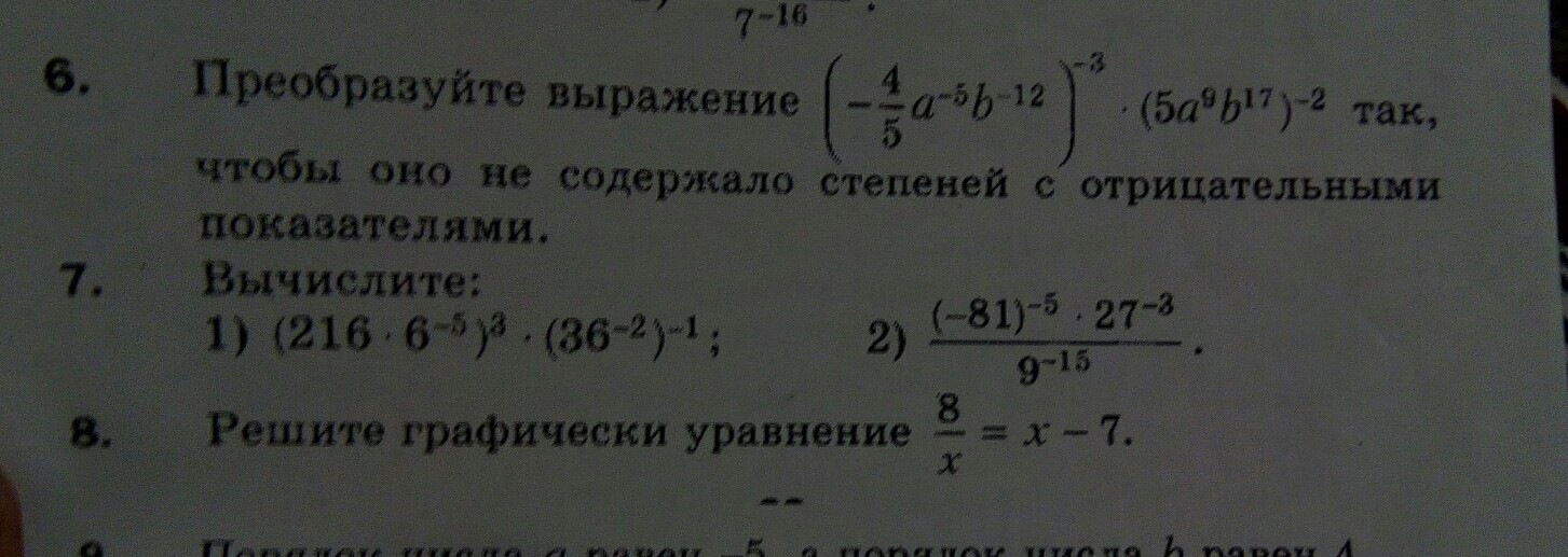 7.1) (216*6^{-5})^3 (36^{-2})^2=(216/(6^{5}))^3*36^2 = (6^3 /6^5 )^3 * (6^4) = (1/ 6^2)^3 * 6^4 = 6^4 / 6^6 = 1/ 6^2 = 1/36