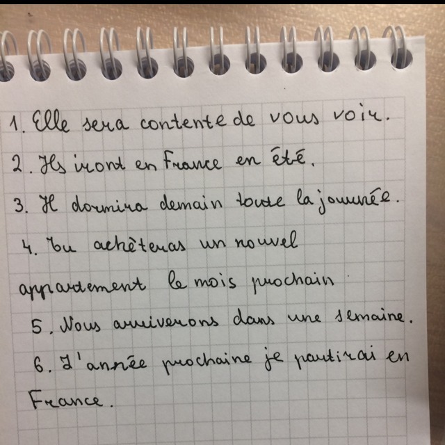 l. Elle (être) contente de vous voir. 2. Ils (aller) en France en été 3. Il (dormir) demain toute la journée. 4. Tu (achèter) un nouvel appartement le mois prochain 5. Nous (arriver) dans une semaine. 6. L'année prochaine je (partir) en France. Поставьте глагол в простом будущем времени (Future simple)