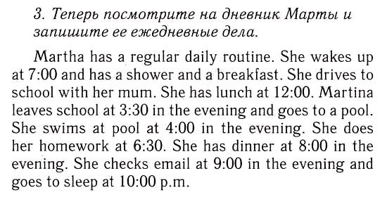 Марта имеет регулярную ежедневную рутину. Она просыпается в 7:00 и есть душ и завтрак. Она едет в школу со своей мамой. Она обедает в 12: 00. Мартина уходит из школы в 3: 30 вечера, а я иду в бассейн. Она плавает в бассейне в 4:00 вечера . Она делает домашнее задание в 6: 30. Она обедает в 8:00 вечера . Она проверяет почту в 9:00 вечера и ложится спать в 10:00 вечера