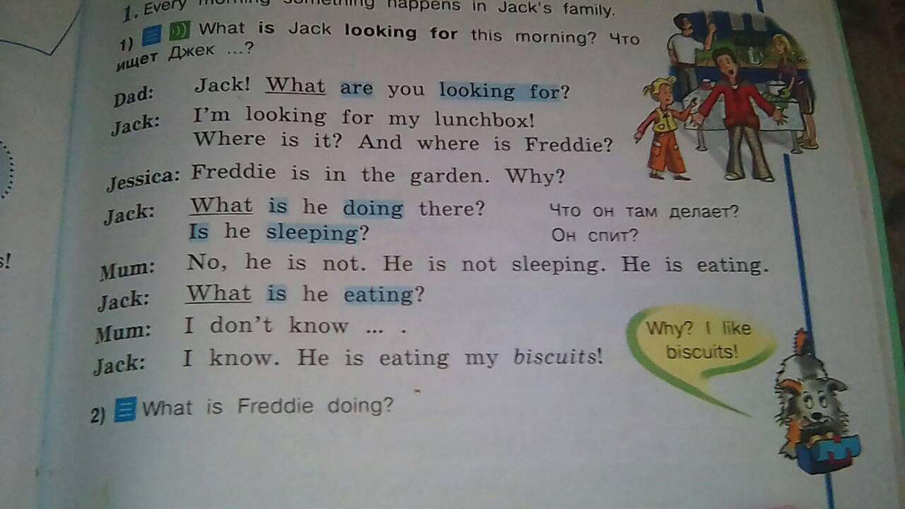 Джек!Что ты ищешь? Я ищу свой ящик для завтрака! Где он?А где Фредди? Фредди в саду. Зачем?Что он там делает?Он спит? Нет,он не. Он не спит. Он ест.Что он ест?Я не знаю... Я знаю. Он ест мое печенье!