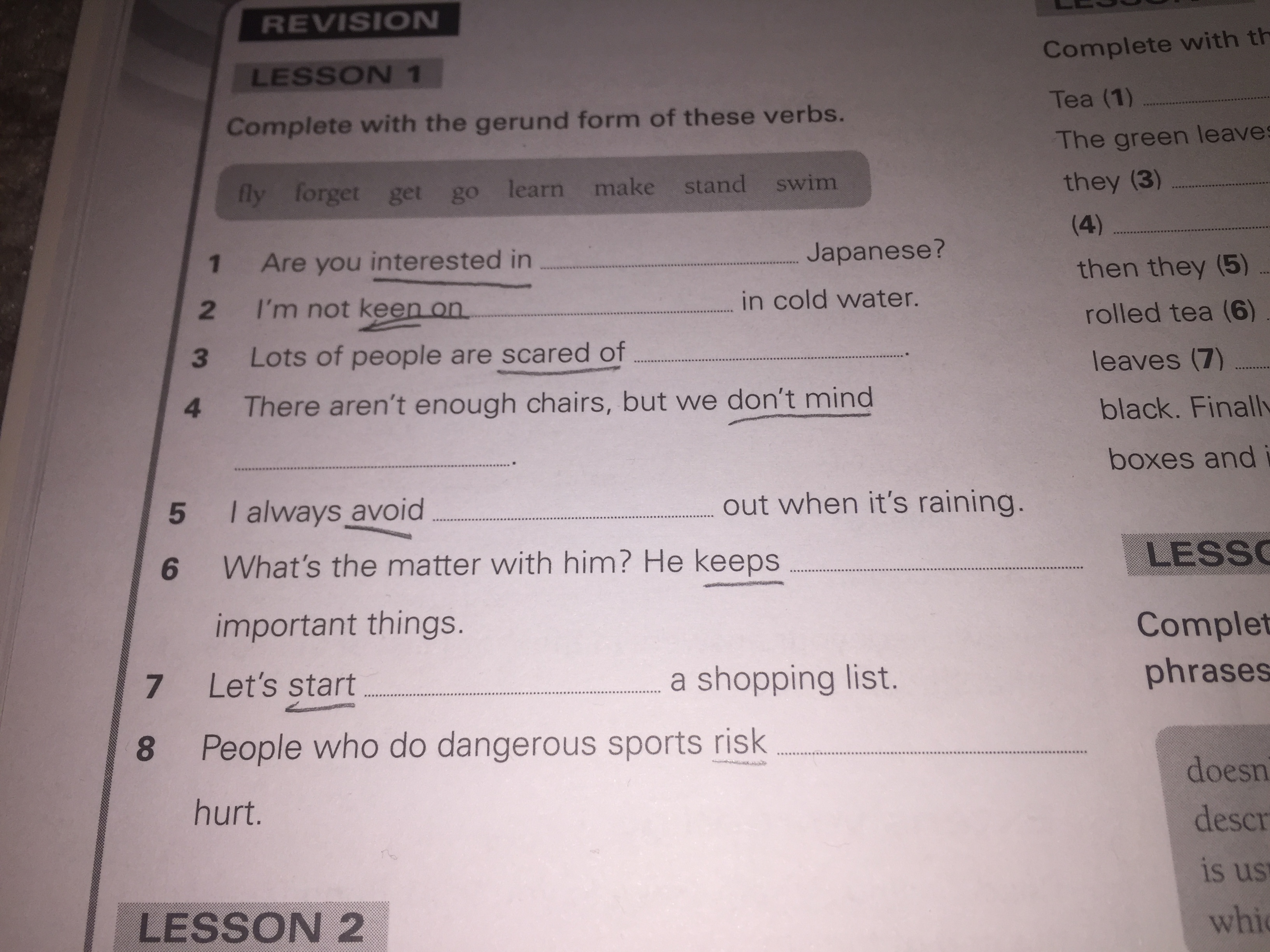 1.Are you interested in learn Japanese? 2.im not keen on swim in cold water.3.Lots of people are scared of fly4. There aren't enough chairs, but we don't mind stand5. I always avoid go out when it's raining. 6. What's the matter with him? He keeps forget important things. 7.Let's start a make shopping list. 8.People who do dangerous sports risk get hurt.