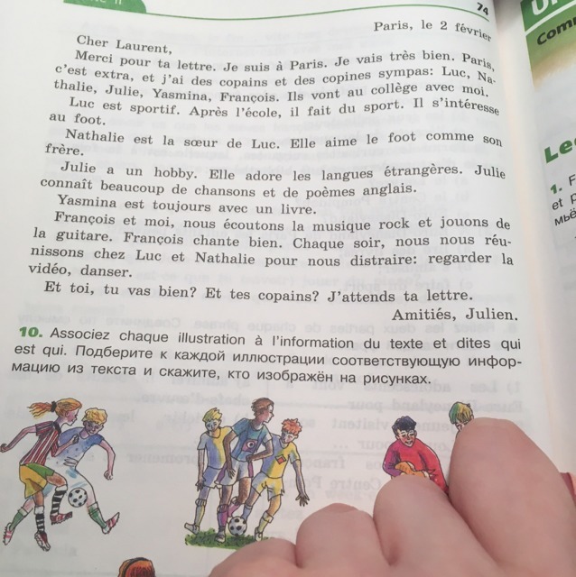Париж, 2 февраля Шер Лоран, я в Париже. Я в порядке. Спасибо за ваше письмо. это дополнительно, и я и славные подружки: Люк, друзья, Тали, Джули, Ясми Франсуа. Они идут в колледж со мной, чтобы Люк - спорт. школу, он занимается спортом. Он интересуется футболом. После Натали - сестра Люка. Она любит футбол, как ее брат. У Джулии есть хобби. иностранных языков. Джулия знает много английских песен и стихотворений Ясмина всегда с книгой. и давайте играть с Франсуа и я, мы качаем гитару. Франсуа хорошо поет. Каждую ночь мы встречаемся в доме Люка и Натали, чтобы развлечь нас: смотреть видео, танцевать. И ты, ты хорошо? А ваши друзья? Я жду письма. Твоя дружба, Жюльен.