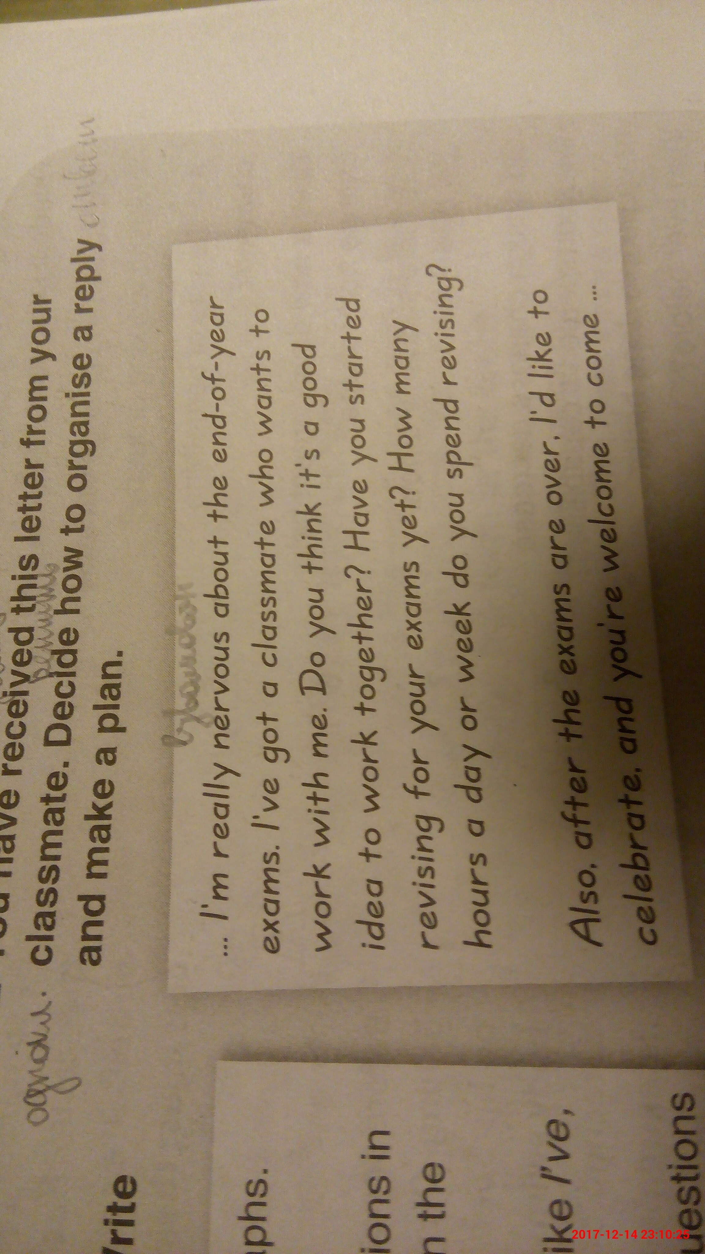 Я очень нервничаю по поводу экзаменов на конец года. У меня есть одноклассник, который хочет работать со мной. Считаете ли вы, что это хорошая идея для совместной работы? Вы уже начали пересматривать экзамены? Сколько часов в день или неделю вы проводите пересмотр? Кроме того, после окончания экзаменов я хотел бы отметить, и вы можете прийти