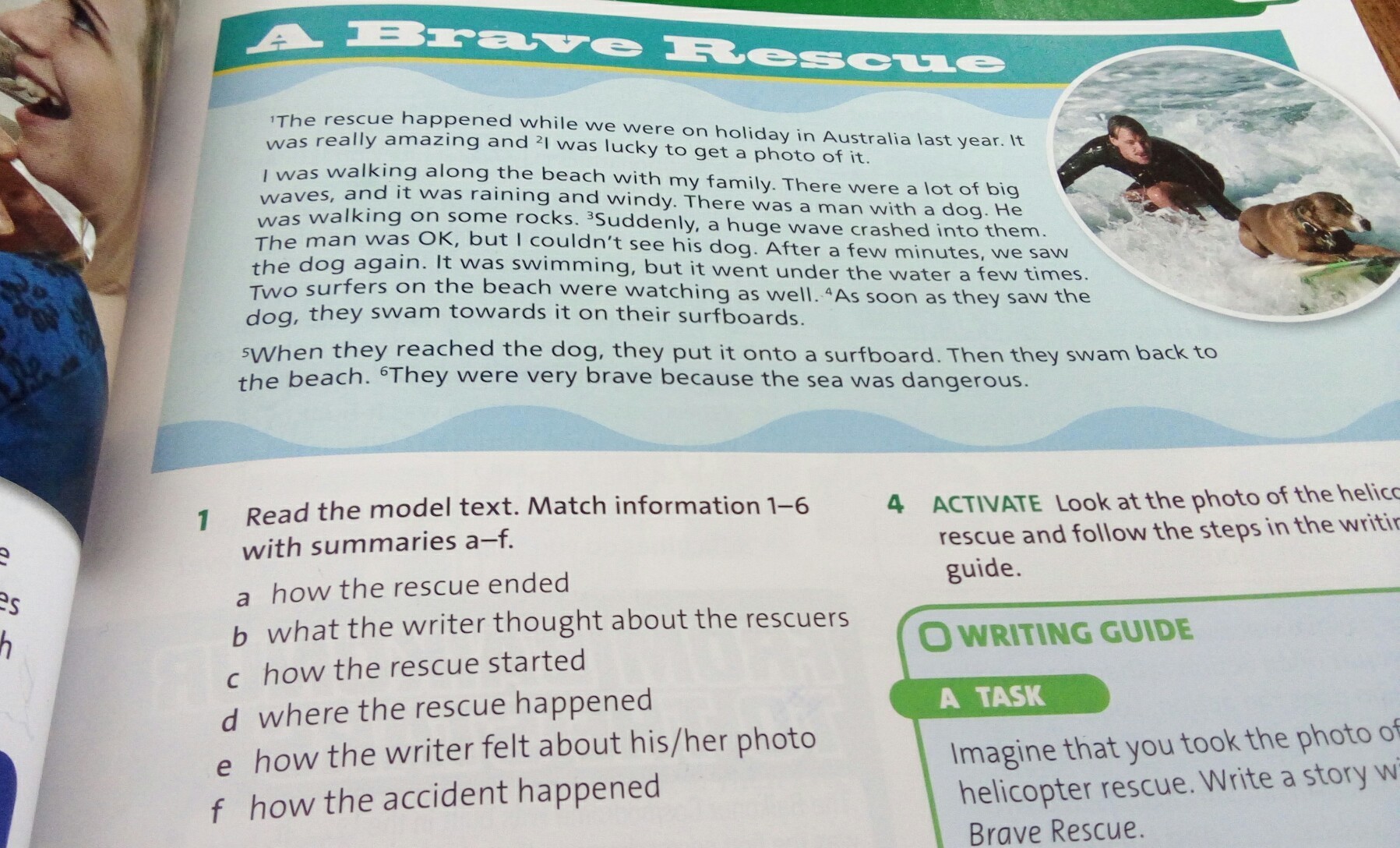 f. the weather was windy and rainy. the man was walking with his dog near sea. the big wave crashed them but the man was ok. writer with his family sew everythinh/ 2 surfers were near and they run into water immediatly for searching dog