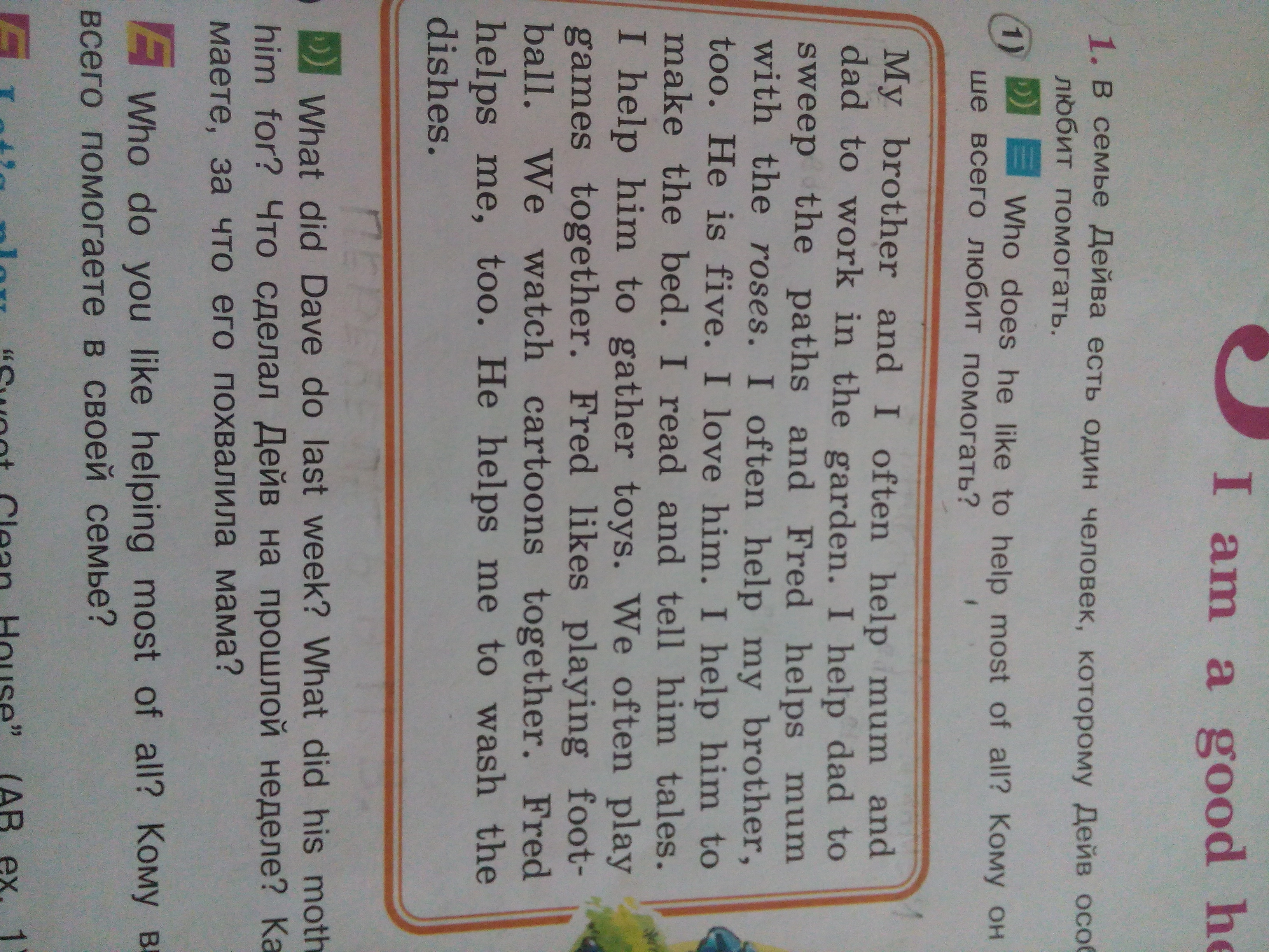 Мой брат и я часто помогаем маме и папе с работой в саду. Я помогаю папе поливать растения, и Fred помогает маме с розами . Я часто помогаю своему брату. Ему пять лет. Я люблю его . Я помогаю ему заправить постель . Я читаю и рассказываю ему сказки. Помогаю ему убрать игрушки. Мы часто играем вдвоём. Мы смотрим мультики вместе. Fred помогает мне тоже. Он помогает мыть посуду